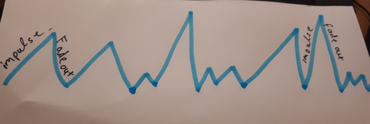 What is more, reflecting on my videos and also discussing with my coach, I acknowledged that practicing in this way led me to develop a sort of a habitual pattern- a specific time quality- that I keep on following while moving. I ‘take’ an impulse and then I let it fade out- GO AND STOP-. It is a repetitive cycle that I would draw it like this: