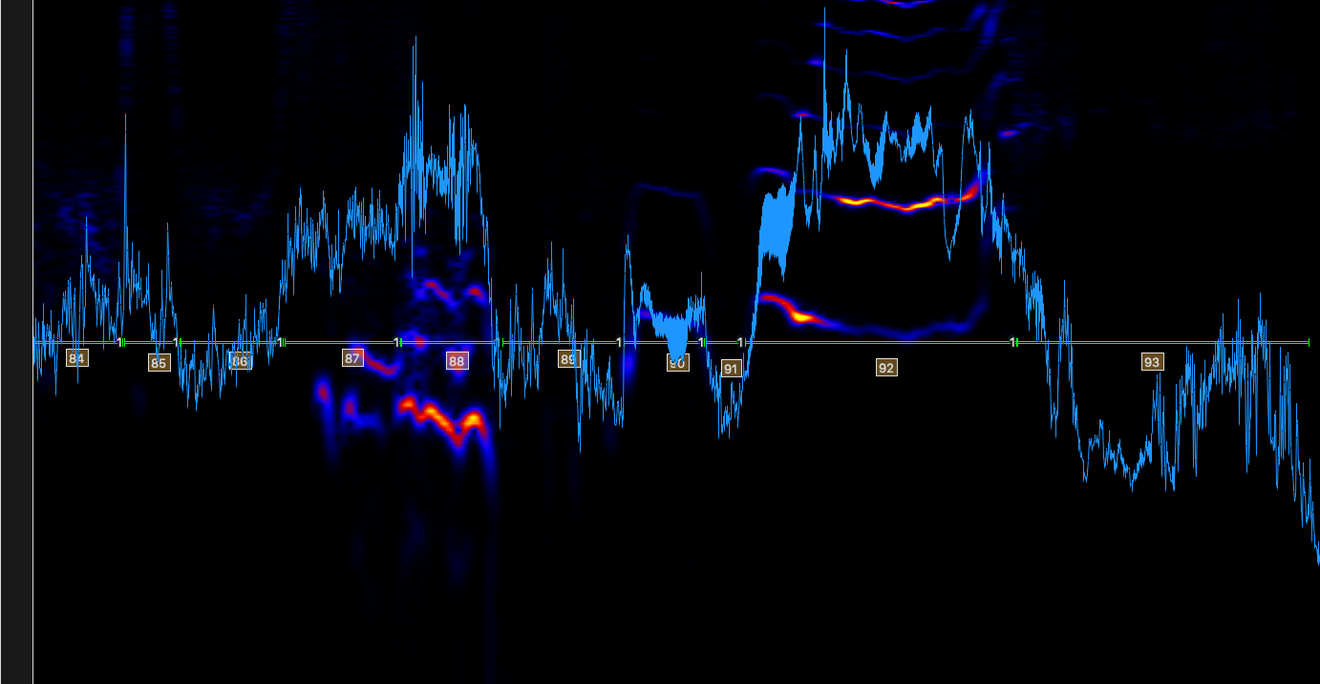 Audio 2: In this 10 seconds-passage different type of gestures are present: 84-86, 89, 91 and 93 are non-vocalic since no frequency (as pitch) spectra is present; 87 and 90 are mixed; and 88 and 92 are only vocalic gestures (see Figure 2 in the background of this exhibition).