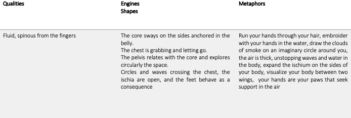 There is huge literature studying the transmission of knowledge embedded within movement practices and modes of creating. For the purpose of my research I refer to a selection of sources that somehow can help me in situating and organizing this phase of the work. An inspiring approach is the pre-choreographic kit by Emio Greco and Peter C. Scholten where the two choreographers define methodologies for the articulation of dance experiences using intuitive images for transmission of material. Particularly meaningful appears to me their work on extracting the intention, the mental state and potential definition that could inspire the reader to understand how movement is generated (Bermudez and Ziegler, 2014). Similarly, few years before Steve Paxton developed his “material for the spine” as a way to guide and shape improvisation, followed later by William Forsythe “Improvisation Technology” and Wayne Mc Gregor’s “Choreography and Cognition” (Bleeker, 2016). I have noticed that despite being overarchingly present in the nature of their work, these latter were more focus in discerning the choreographic process rather than bringing to surface specific qualities of movement material.