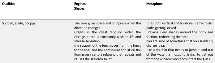Starting from the awareness that movements are initiated anatomically, but also informed by thoughts and intuitive processes, my guiding approach for this research phase is their description and classification connected with sensations and their peculiar anatomical focus.