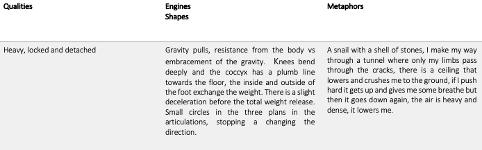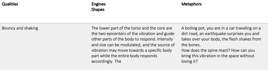 There is huge literature studying the transmission of knowledge embedded within movement practices and modes of creating. For the purpose of my research I refer to a selection of sources that somehow can help me in situating and organizing this phase of the work. An inspiring approach is the pre-choreographic kit by Emio Greco and Peter C. Scholten where the two choreographers define methodologies for the articulation of dance experiences using intuitive images for transmission of material. Particularly meaningful appears to me their work on extracting the intention, the mental state and potential definition that could inspire the reader to understand how movement is generated (Bermudez and Ziegler, 2014). Similarly, few years before Steve Paxton developed his “material for the spine” as a way to guide and shape improvisation, followed later by William Forsythe “Improvisation Technology” and Wayne Mc Gregor’s “Choreography and Cognition” (Bleeker, 2016). I have noticed that despite being overarchingly present in the nature of their work, these latter were more focus in discerning the choreographic process rather than bringing to surface specific qualities of movement material.