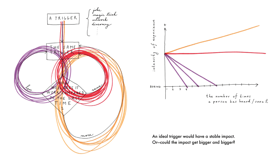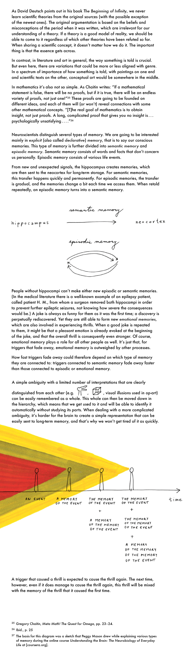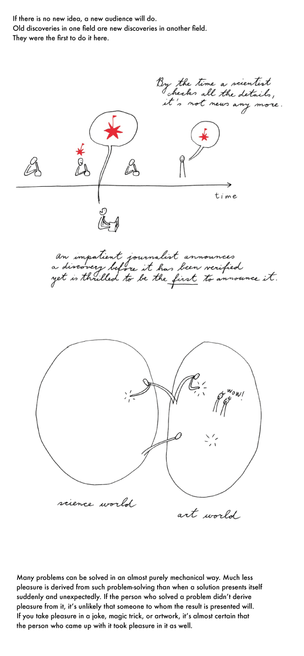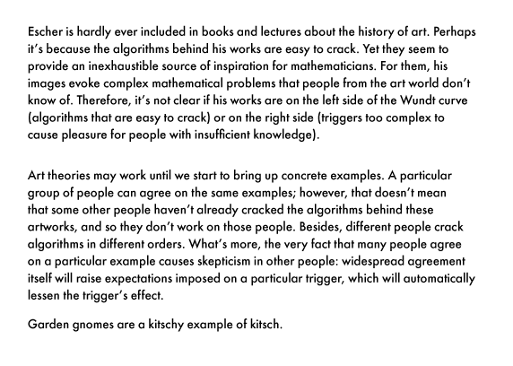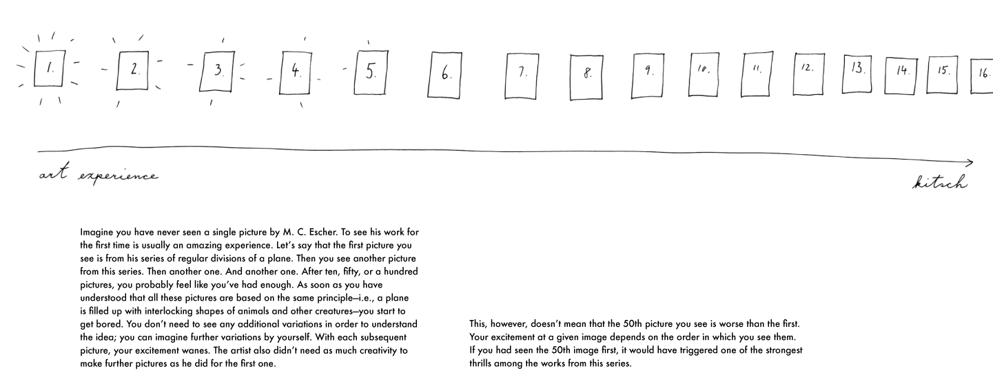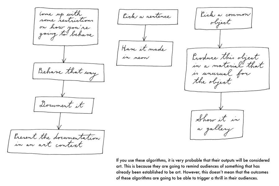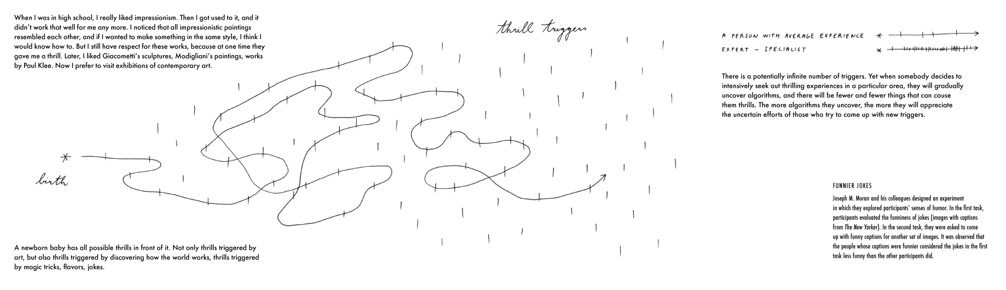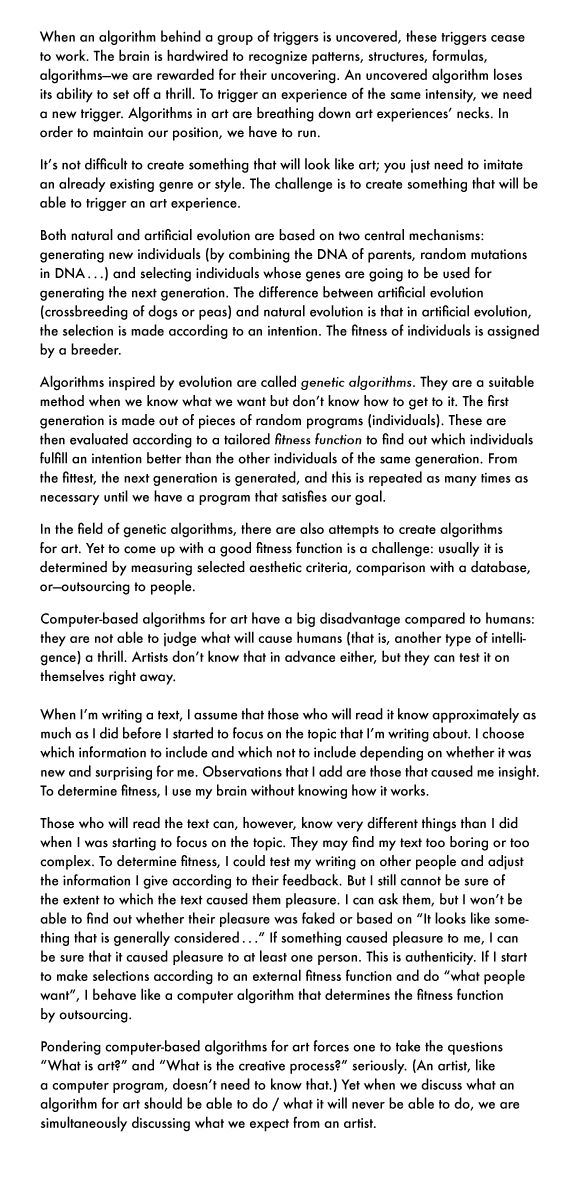 Many people seem to be irritated by the idea that an algorithm could generate thrill-triggering artifacts. I suppose this aversion comes from a fear of losing thrills caused by inventing/creating/discovering. But the motivation of those who try to invent an algorithm for art is, in fact, precisely this: If they succeeded in creating a really good algorithm, it would cause them a huge thrill.