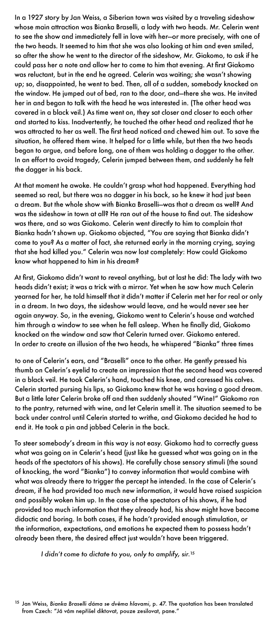 Weiss, Jan. Bianka Braselli dáma se dvěma hlavami. Prague: Československý spisovatel, 1961. (the story was first published in 1927 in the book Zrcadlo, které se opožďuje)