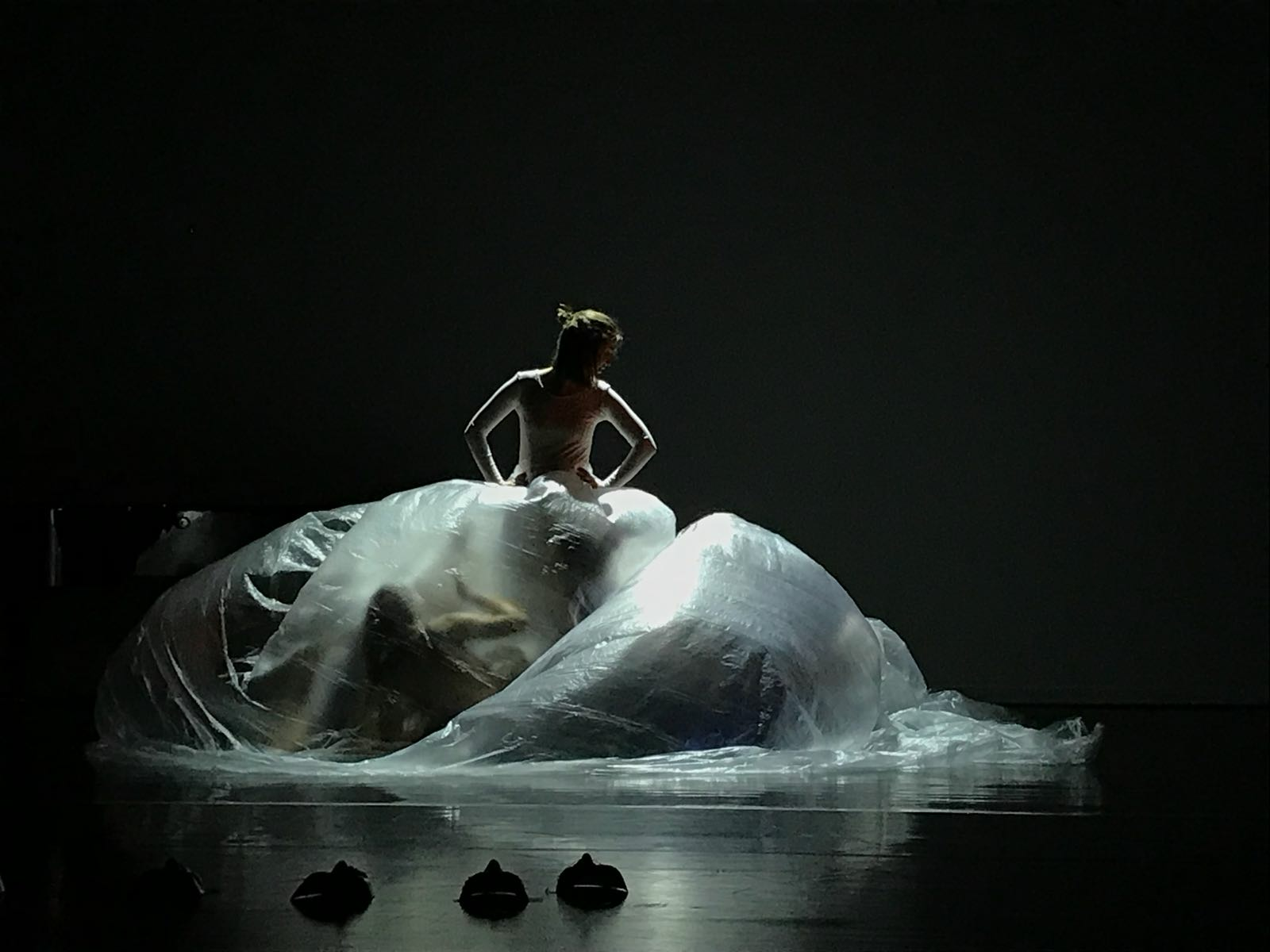 The piece investigates transdisciplinary transformations within contemporary dance, music, story telling, neutral mask theatre practise, light design.