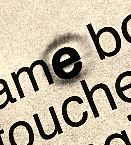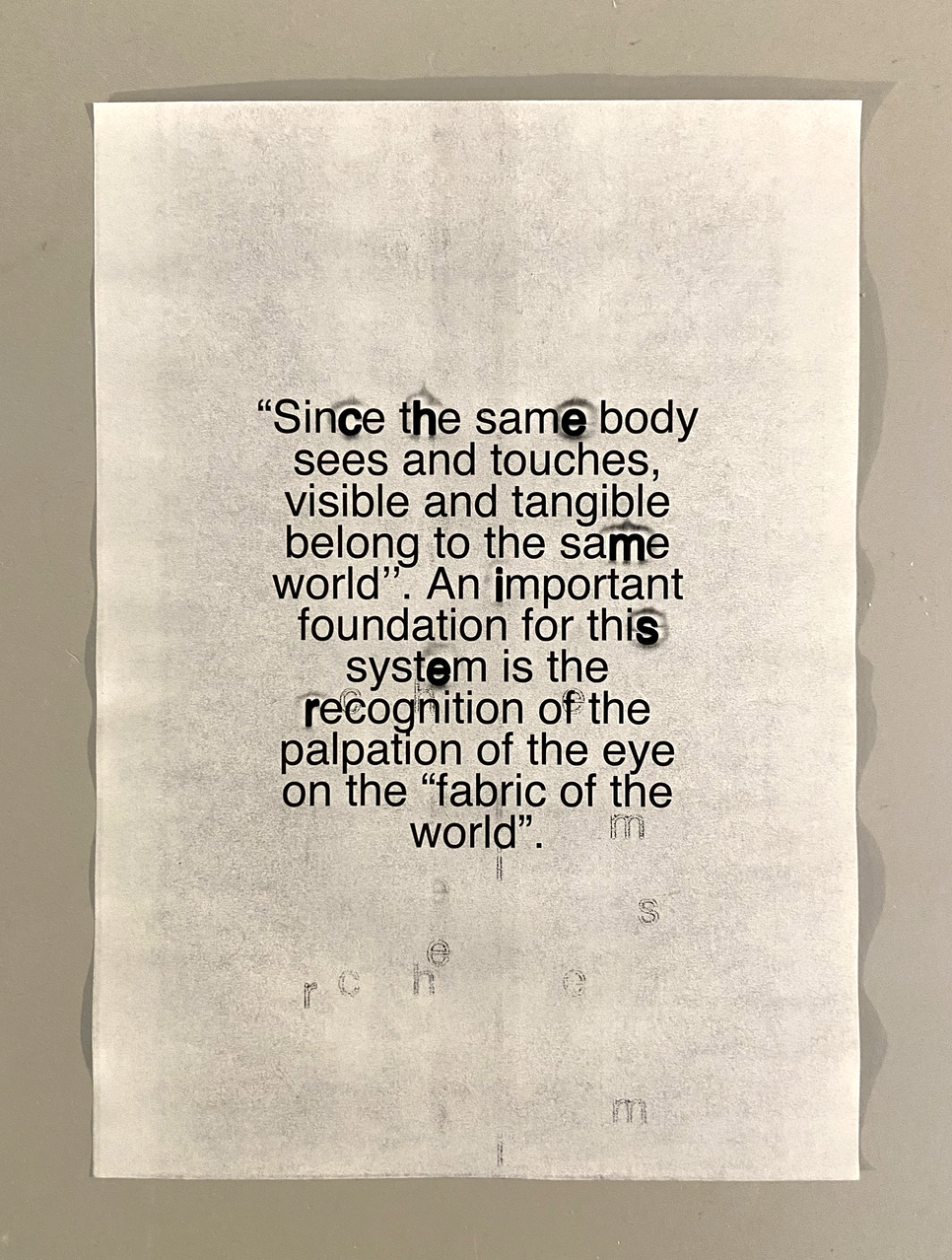 The provided image depicts a laserprinted quote from philosopher Maurice Merleau-Ponty. Eight letters are forming the word 'chemiser'; a french culinary verb used to describe anytype of food in a coating.