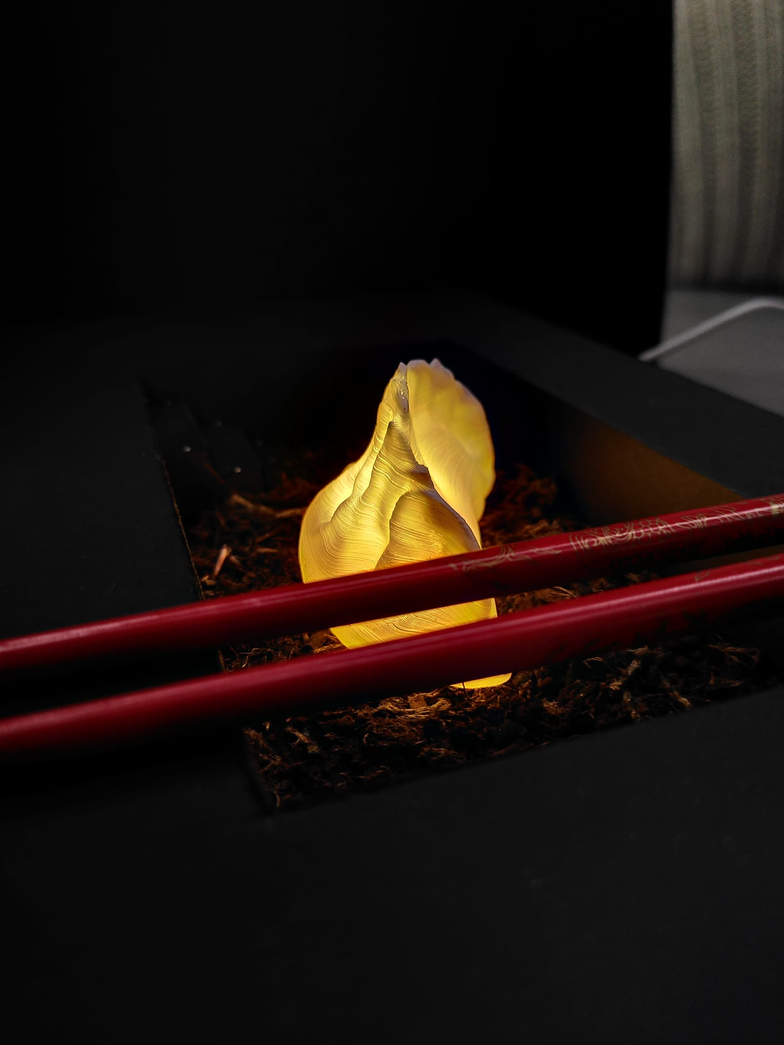 As an ending, the gyoza is placed on it's plate, and magically lights up.
