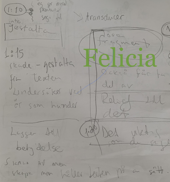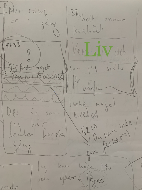 Felicia: For me it is both the movement and the sculpture. And like...my own ‘skal’ (meaning: shell). This whole fossilised ocean, all those shells that create these amazing sounds together with the water and the air and the earth. And that lives...or do they perhaps not live? There are so many dimensions to this. But vocally, to improvise on ‘skal’, I could do that whenever and for hours on end. I cannot explain it...for it is something about the word that I do not understand. What form it has. I am maybe wondering about that. Certain things, like you take ‘blomma’ (meaning: flower). Like: ‘blomma’, it is like…. Like a...it is fun...but ‘skal’.... It becomes...I have never expressed it in this way but just had the sensation. So it is also the first time that I experience this within myself. I think it is exciting to follow what happens when you meet something. Here I am doing it in a specific context, and I have not done that earlier. Then I just went for it. But here, I remain with the sensorial feelings of the word itself. I do not leave the word. It is between the sound, and the word, and the meaning. It is hard…. It is just such a favourite. ‘skal’. And it is also a discovery, that I made when I received the score. I felt: ‘skal’...I just love it and I had no idea that I did. (stimulated recall annotations, April 15-16, 2021)