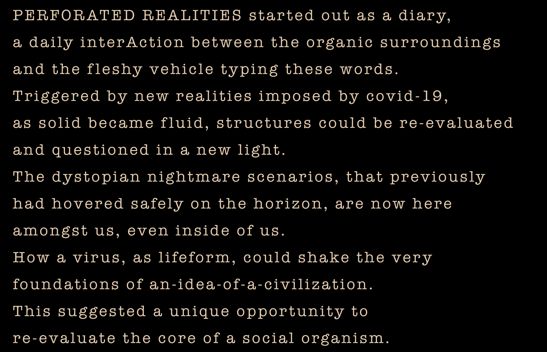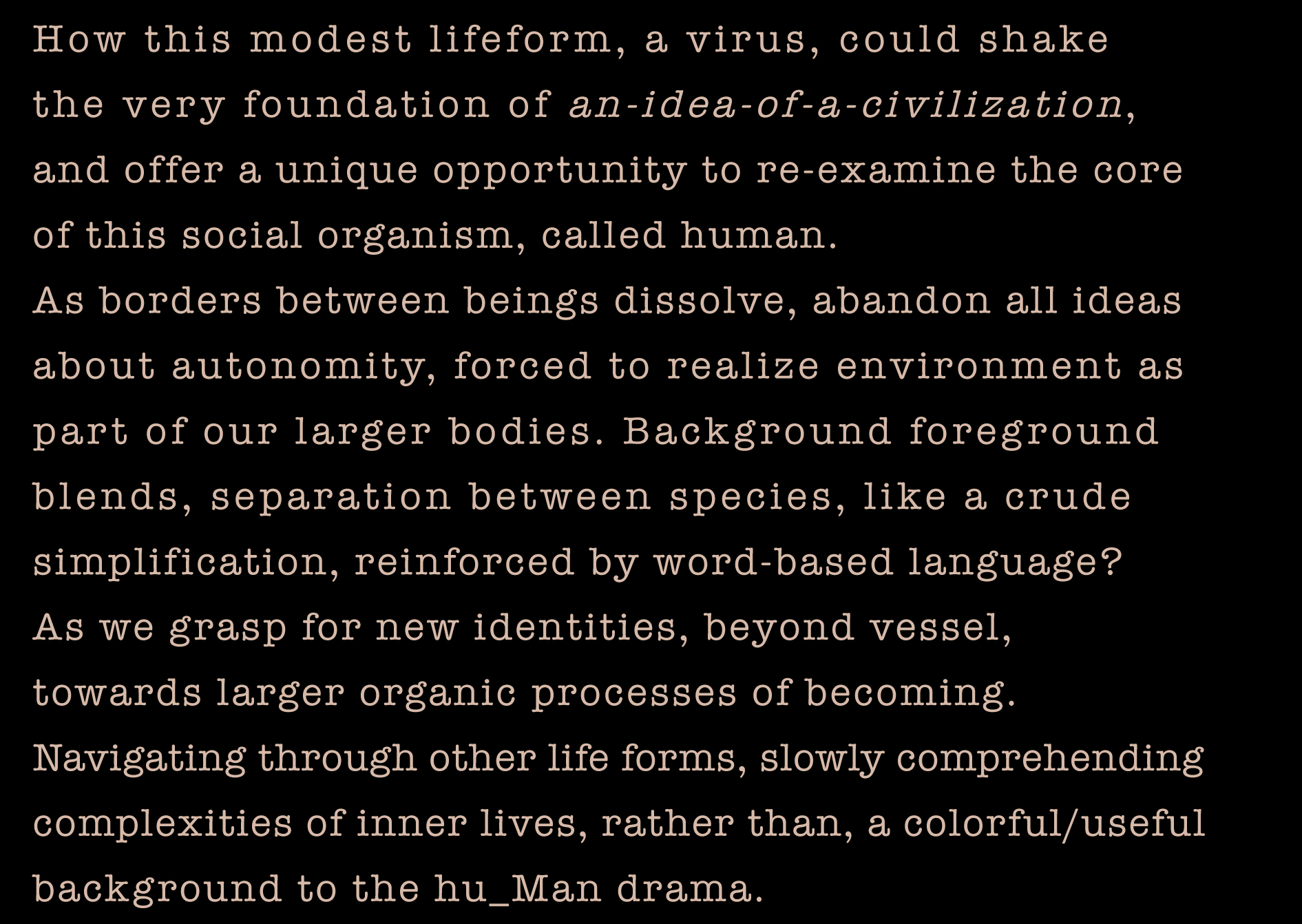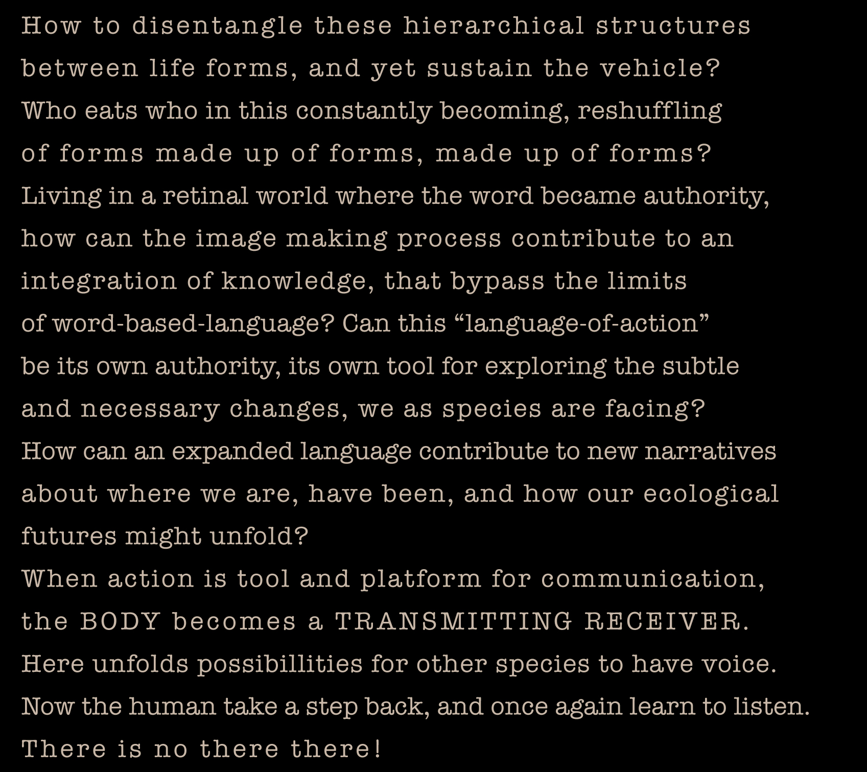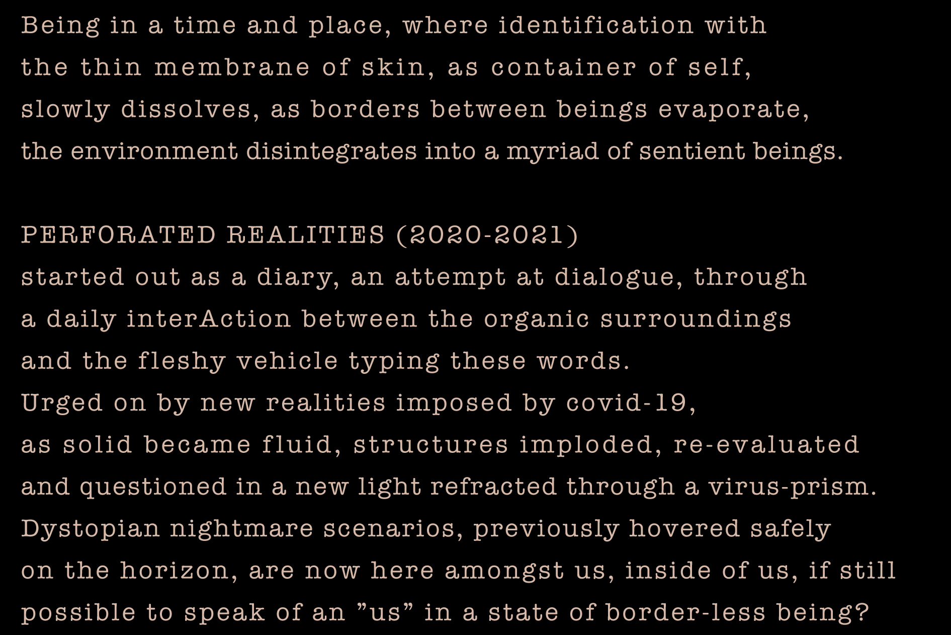 “Being in a time and place, where identification with the thin membrane of skin, as container of self, is slowly dissolving, as borders between beings evaporate, the environment disintegrates into a myriad of sentient beings.”