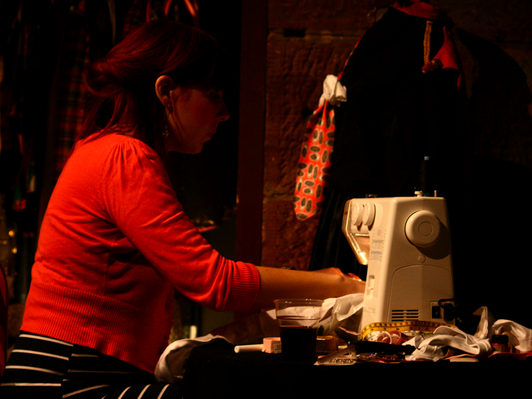 This station consisted of a rail of costumes from past Arches shows, including ‘madly glam frou-frou costumes’ [9], alongside wigs and clown suits, a sewing machine and various fabrics, and blank t-shirts with fabric pens for do-it-yourself design. The rail was situated inside an alcove in the wall and a fabric screen was positioned in front of it, creating a dressing room. A mannequin body and separate head displayed costumes and wigs, which were re-dressed several times over the two nights.