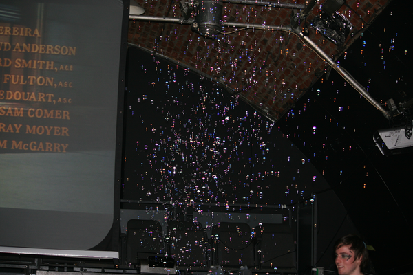 The snow, bubbles and smoke also worked alongside the other elements in the space in a number of unexpected ways and often seemed to draw everything together. At one point a visitor shone a torch light through the smoke and whenever the bubbles drifted behind the projection screen they cast a shadow onto the projection of the films that were playing. On the second night the smoke machine broke, so only snow and bubbles were available.