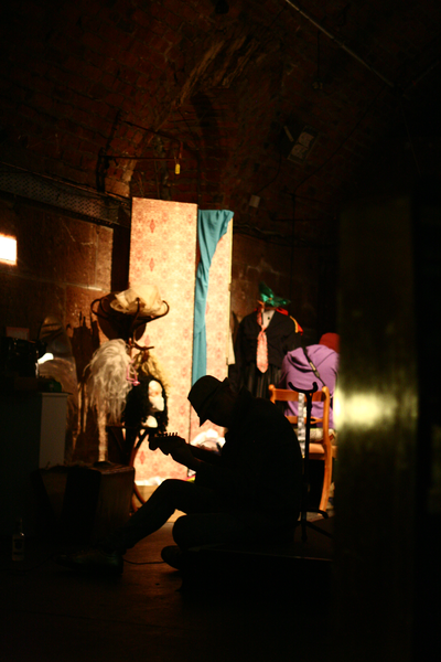 As well as the professional theatre lighting, a number of torches and lamps were available to be moved around the space. The lamps could be plugged into points around the room, and had adjustable heads with their own dimmers attached, so that light could be arranged in various directions and levels of intensity. A range of different lighting states was used, and often when a tangible theatrical performance occurred (if somebody spoke into the microphone or played a guitar for example) others would direct lights towards them, creating temporary ‘stages’ around the room. The lighting also worked with other elements of the space; a torch shone through smoke or a moment of darkness while solemn music was played. This was one of the key areas where visitors to the space worked together to create the overall aesthetic. The simple operation of lighting using the lamps had the potential to significantly affect the atmosphere in the room, yet afforded the anonymity of an operating position removed from the areas where theatrical performances were occurring. Perhaps for this reason moving and controlling the lamps was one of the most popular uses of the space, even though few visitors operated lighting from the desk.
