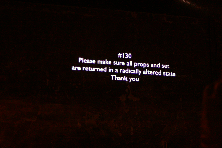 On the back wall of the studio was a list of titles, numbered from one to two hundred, including blank spaces for visitors to add their own. These titles were entered into a computer programme, which was connected to a projector. By typing a number from the list into a numeric keypad and pressing ‘enter’, the title was projected on the wall above the space. The titles included quotes, ‘#1 Work as if you live in the early days of a better nation’; slogans, ‘#67 Just do it’; and instructions, ‘#130 Please make sure all props and set are returned in a radically altered state’. Visitors also added their own, which were added to the projection before each evening. For example, ‘#140 Get rid of your TV. Burn it. While you’re at it delete facebook’, and ‘#148 Nick for PM’.