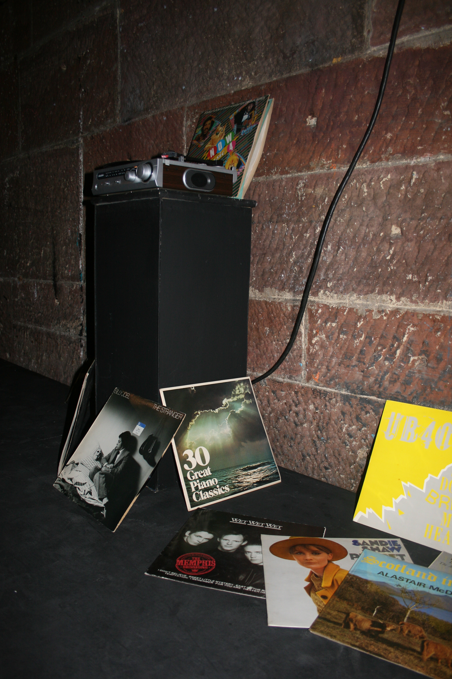 The sound equipment consisted of a large mixer amp with two large speakers that could be wheeled around the space in trolleys and three practice amps that could be plugged in around the room. Available inputs included two record players, two radios and several microphones, two electric guitars and three dictaphones / cassette players. There was also a slightly broken, out of tune piano and a selection of percussion instruments. A collection of LPs and cassettes with a variety of musical styles was also provided.