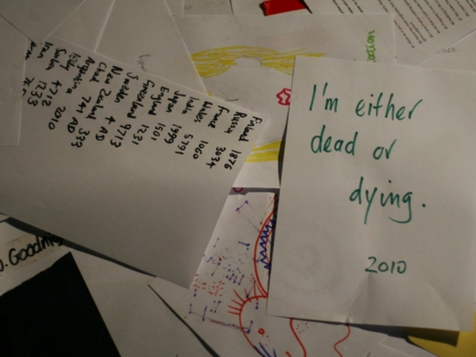 This proved a particularly popular section and prompted a variety of uses. Over the course of the event more and more text was generated, covering a variety of types: lists, stories, confessions, etc. A common use of the space was for visitors to sit on the edge of the pit area and read through what others had written. Occasionally these texts would be read out over the microphone or recorded onto the dictaphones. At the end of the second evening, Kieran Hurley, a previous collaborator, instigated a reading of everything that had been written, one text after the other. This lasted for around half an hour until the end of the event.