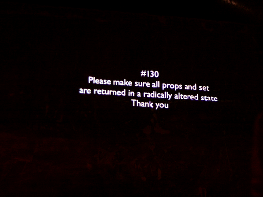 The Forest Fringe Micro-Festival was a ticketed event. For ten pounds, or a concession rate of five pounds, visitors gained access to three of the main arches and several basement rooms as well as the studio where A Work on Progress took place. Although a series of development workshops had indicated a range of ‘currencies’ operating in theatre- including applause, time and labour - money is the hard, tangible currency that pays for theatre production. [44] Processes of capitalist production therefore determine the entire experience. [45] As David Greig points out, money functions dramaturgically in this sense as ‘the theatrical experience becomes shaped [...] so as to best get our money from us’. [46] Despite the relatively small returns on an event that would have cost the Arches a great deal more in associated costs such as technical support and marketing, the commercially orientated business structures of the Arches necessitated an entry fee.