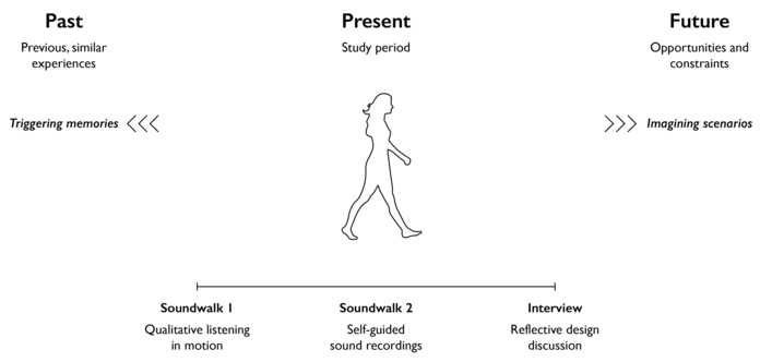 In Figure 1 we provide an overview of the three phases of the study: a first and second soundwalk, followed by a discussion of new technology concepts. This presents how participants move through a temporal process in which they 1) reflect on immediate sounds that 2) trigger memories of similar or related sounds that 3) ultimately aid them in articulating future scenarios for sound zones in their homes. In other words, we extended the soundwalk method to include reflections between participants and interviewer about future and possible designs.