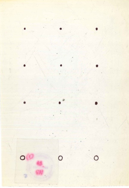 (Sound production may be understood as simply opening doors.) Intersection of second circle = sound in total theatre space (public address system) or at any specific point on the produced line within the space. Two or more points may be taken as a sound in movement. (Open pertinent doors) Movement is also indicated by using transparent map in addition. A single notation will then give two points in space. Several of these may be associated with one sound.”