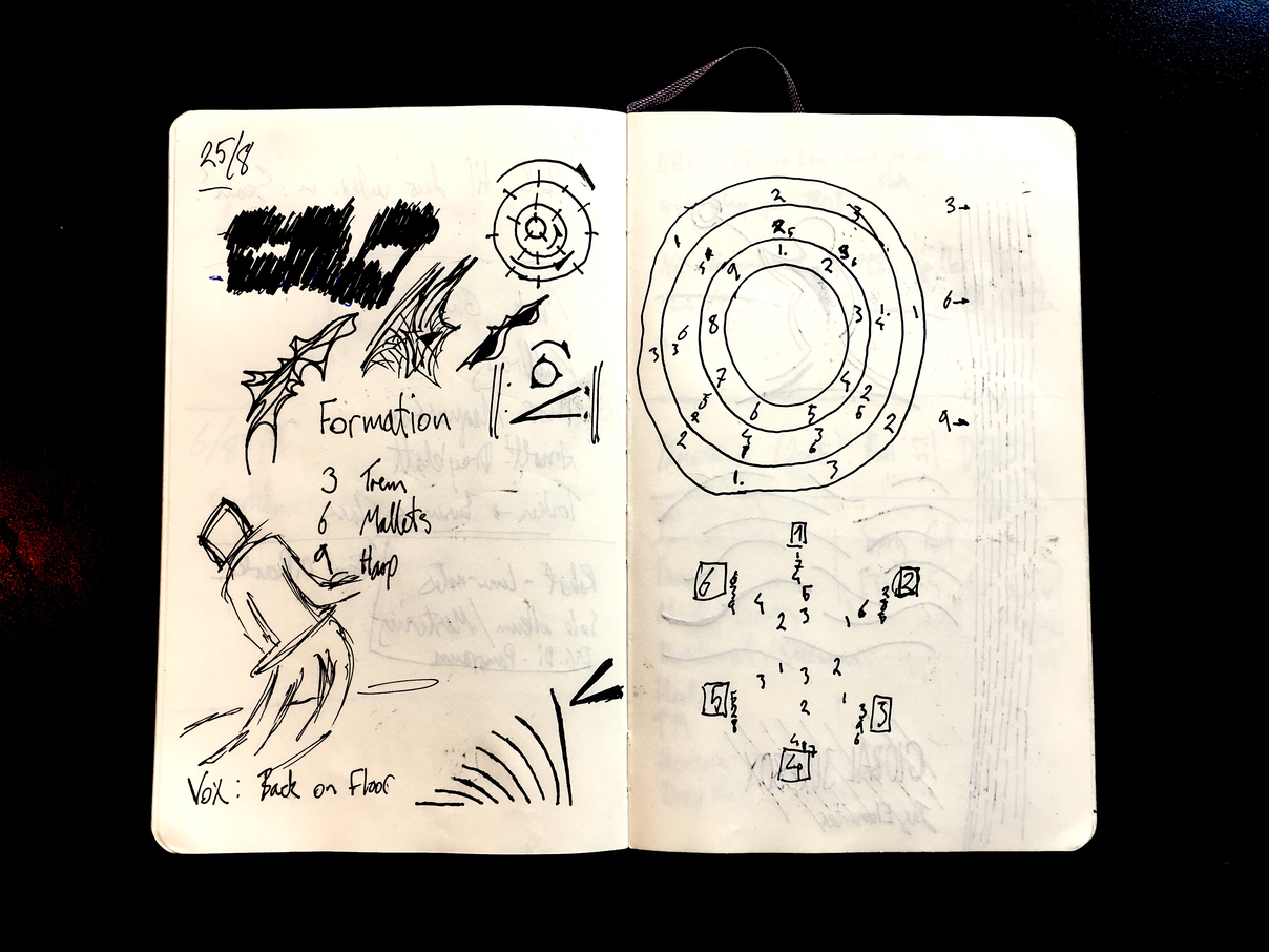 One of my first note book entries at the very beginning of my research at RMC in 2019. A sketch for a composition for a six piece ensemble, in a specific room formation.