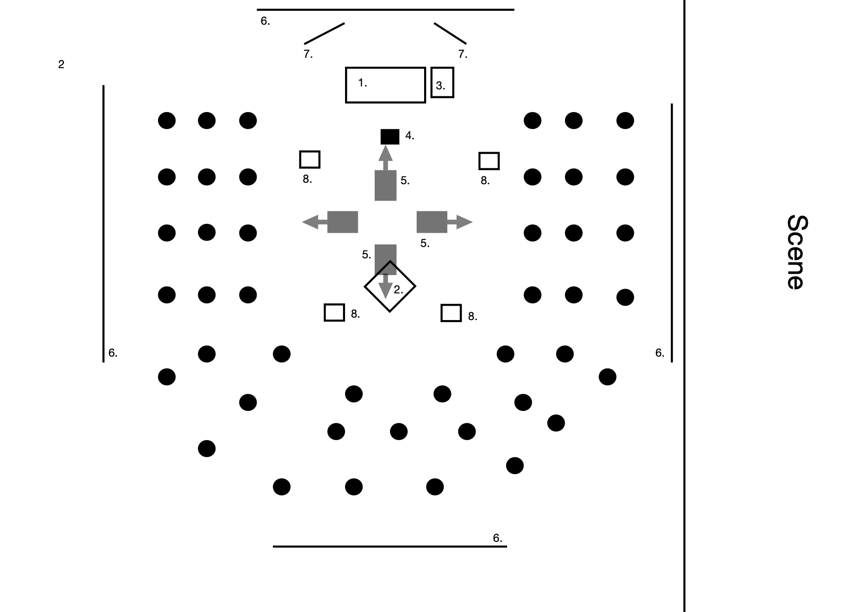 Below is the technical rider I provided for the concert, pictured here to give a clear visual impressions of the spatialisation of the room.