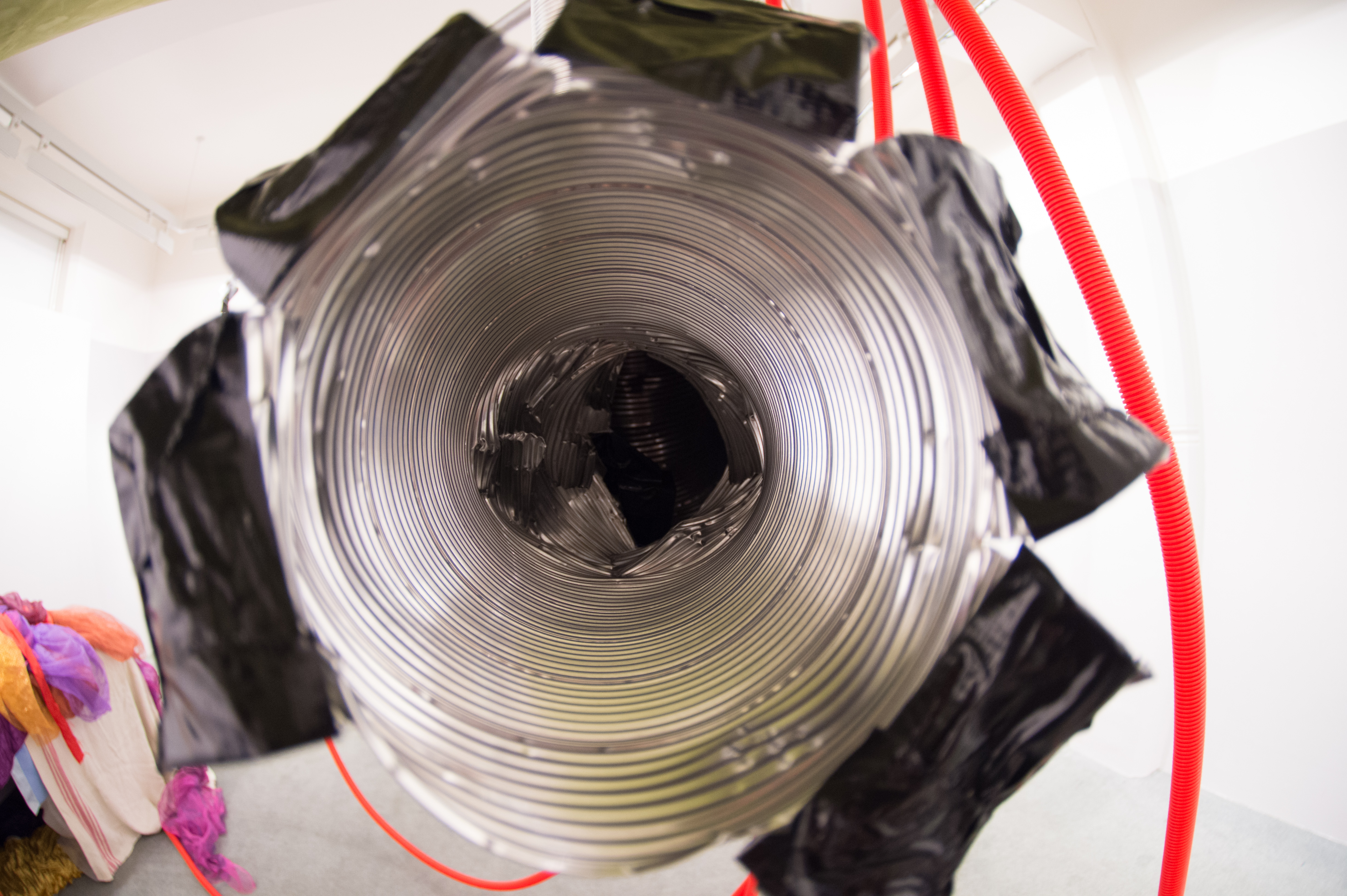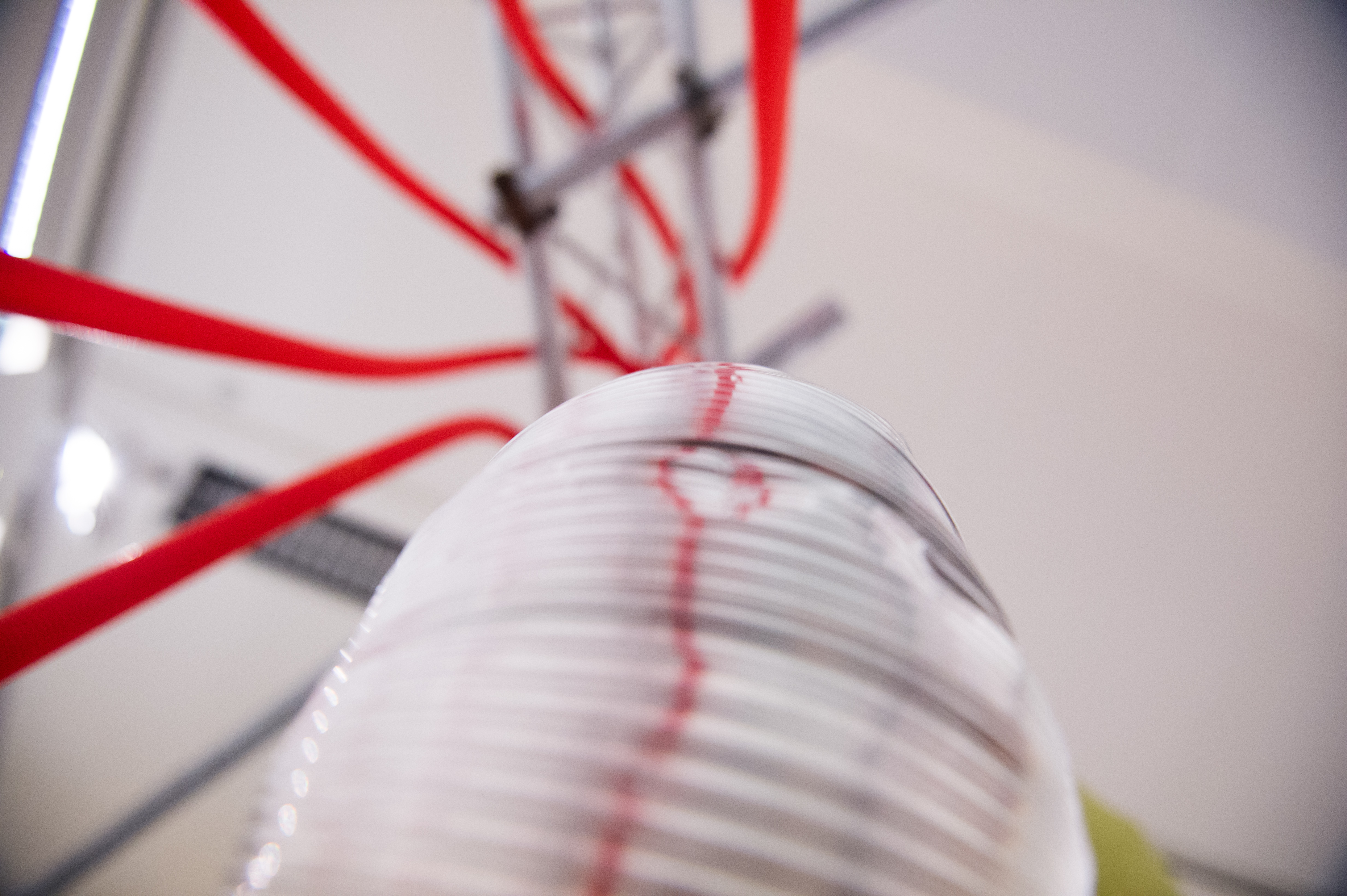 The hum grows and alters; it carves a shifting relational landscape between us, covering areas we can negotiate together without a pre-agreed trajectory to follow. It is ‘no longer a question of intercepting a sound and decoding or interpreting it, but rather of responding to a unique voice that signifies nothing but itself’ (Cavarero 2005: 7). We join together in sound, in what Philosopher Adriana Cavarero describes as ‘the maintenance of a relation that communicates no other meaning than the relation itself’ (ibid.: 195). There is no intention to communicate or to make sense. We are not only connected through sound but also via the red-ribbed plastic tube vibrating in our hands. We are a shifting sonorous landscape that puts us in common outside the voicing of language verging on ‘dangerously bodily, if not seductive or quasi-animal’ (ibid.: 13). A space for being opens, a space for vocal theatre that as soon as the mouth closes, is gone.
