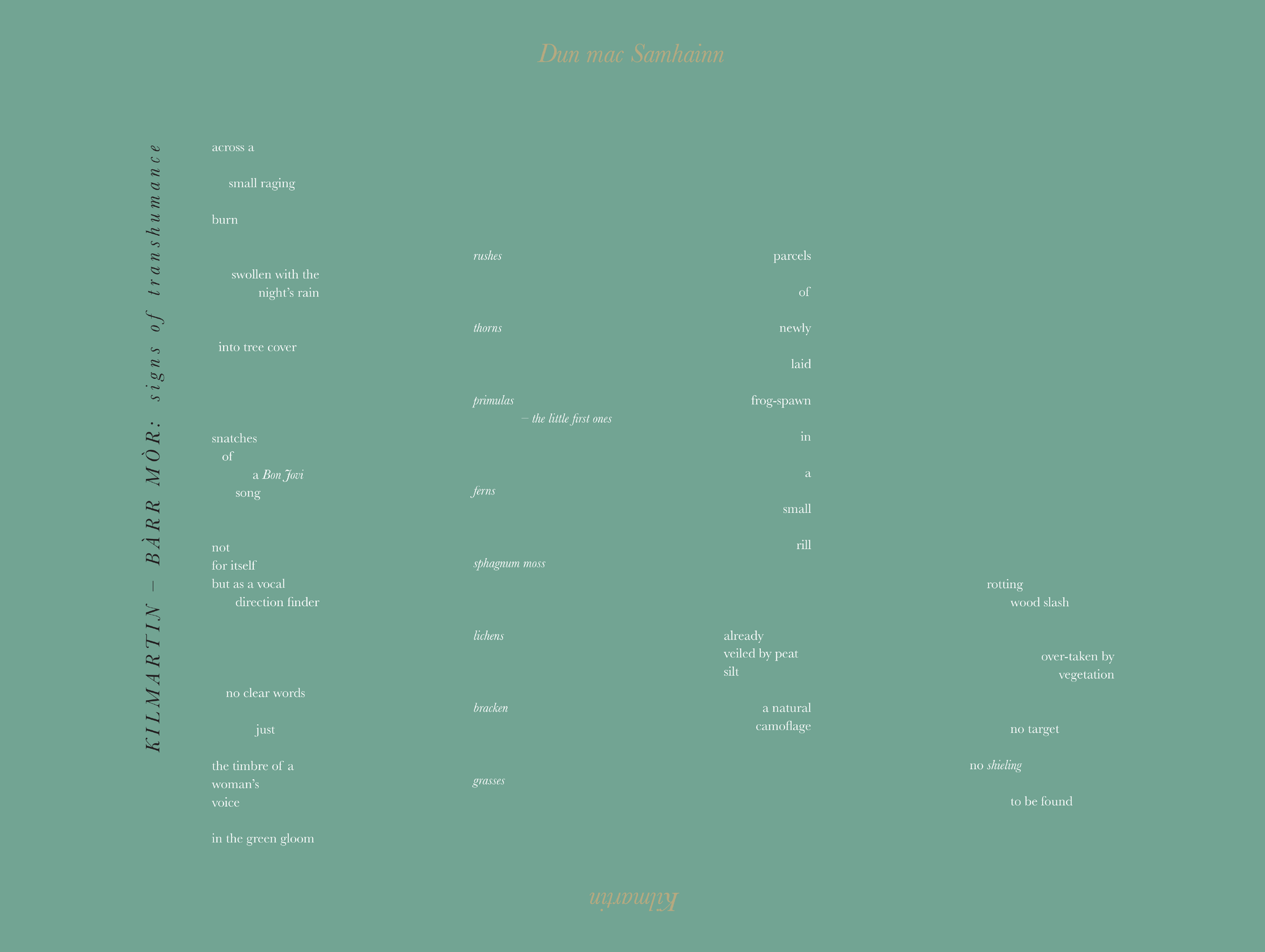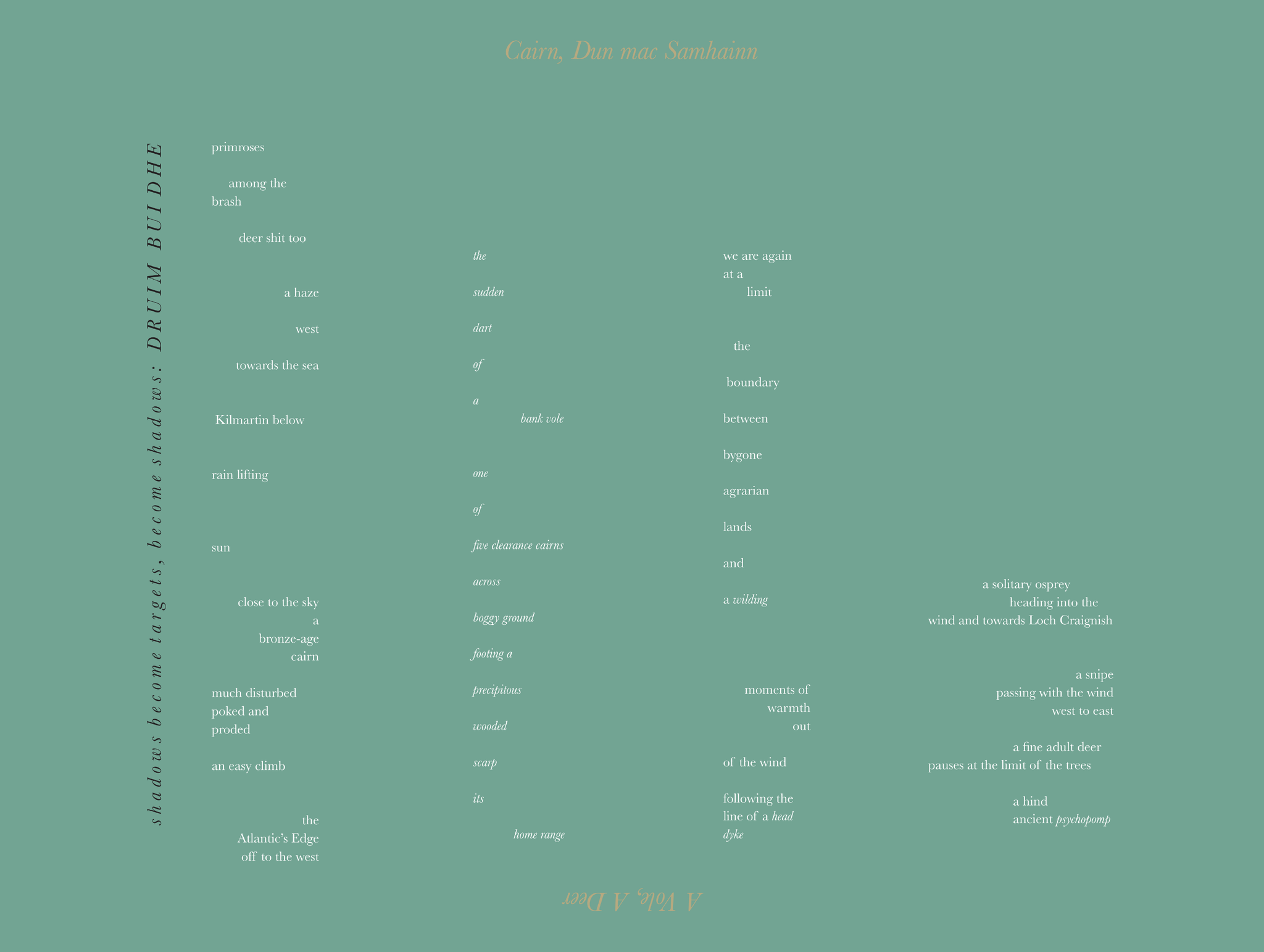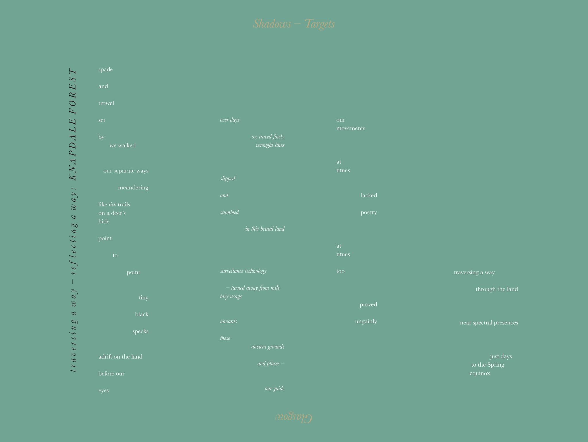 This exposition is based on an archaeological survey in the landscapes around Kilmartin Glen, Argyll and Bute, western Scotland, and references digital datasets – archaeological reference points –alongside the acts (enactments) of field walking, photography, drawing and poetry – experiences and representational discourses – to consider how land and landscapes may be read as dynamic palimpsestic and multi-dimensional fields of entanglement. Digital datasets were used by the survey to garner fruitful material to aid identification and to analyse (subtle) surface archaeological remains in the inhospitable terrain on the hills bordering Kilmartin Glen. By analysing, categorising and archiving such information, through naming and cataloguing, archaeological methodology effectively orders and tames such wildernesses. We, by contrast, are seeking to draw art and archaeological practices into dialogue with one another in order to assert the importance of recording experiences and random acts as a part of field research and, thereby, to both re-vivify and re-wild our encounters with landscape. Our exposition, and shared practices, intentionally encourage nuances of reading and interpretation that are found at the dialogic intersection between an artist/poet encountering archaeological landscape survey, and an archaeologist experiencing artistic, poetic and linguistic readings of land: reflecting in the process upon contemporary methodologies and underlying theoretical discourses. As such this research sits within the wider contemporary turn towards interdisciplinary practice, and seeks to establish a dialogue across disciplines; between humans and landscapes, practice and matter, that provides emerging approaches and hopes to remind us of the wild experience.