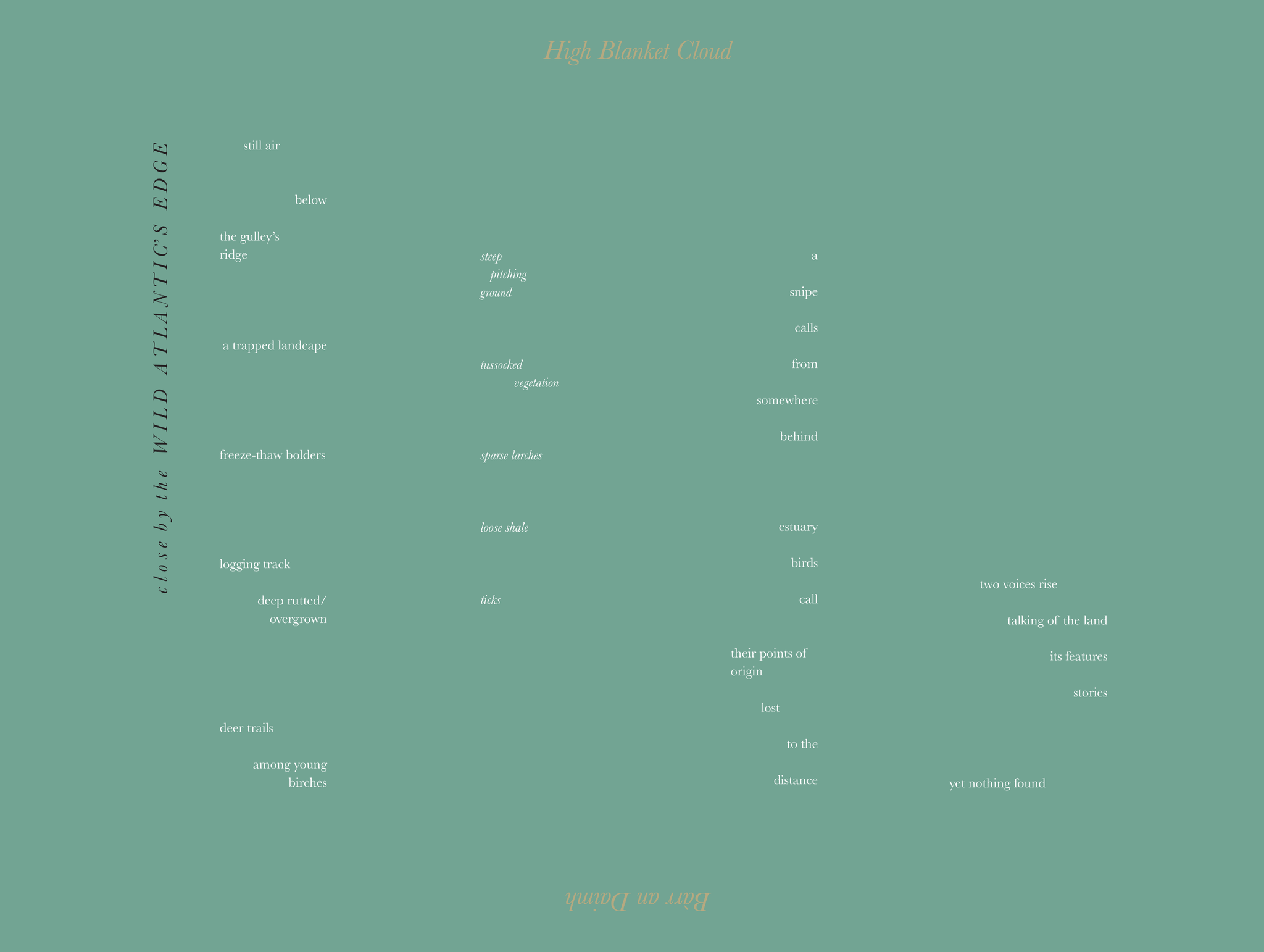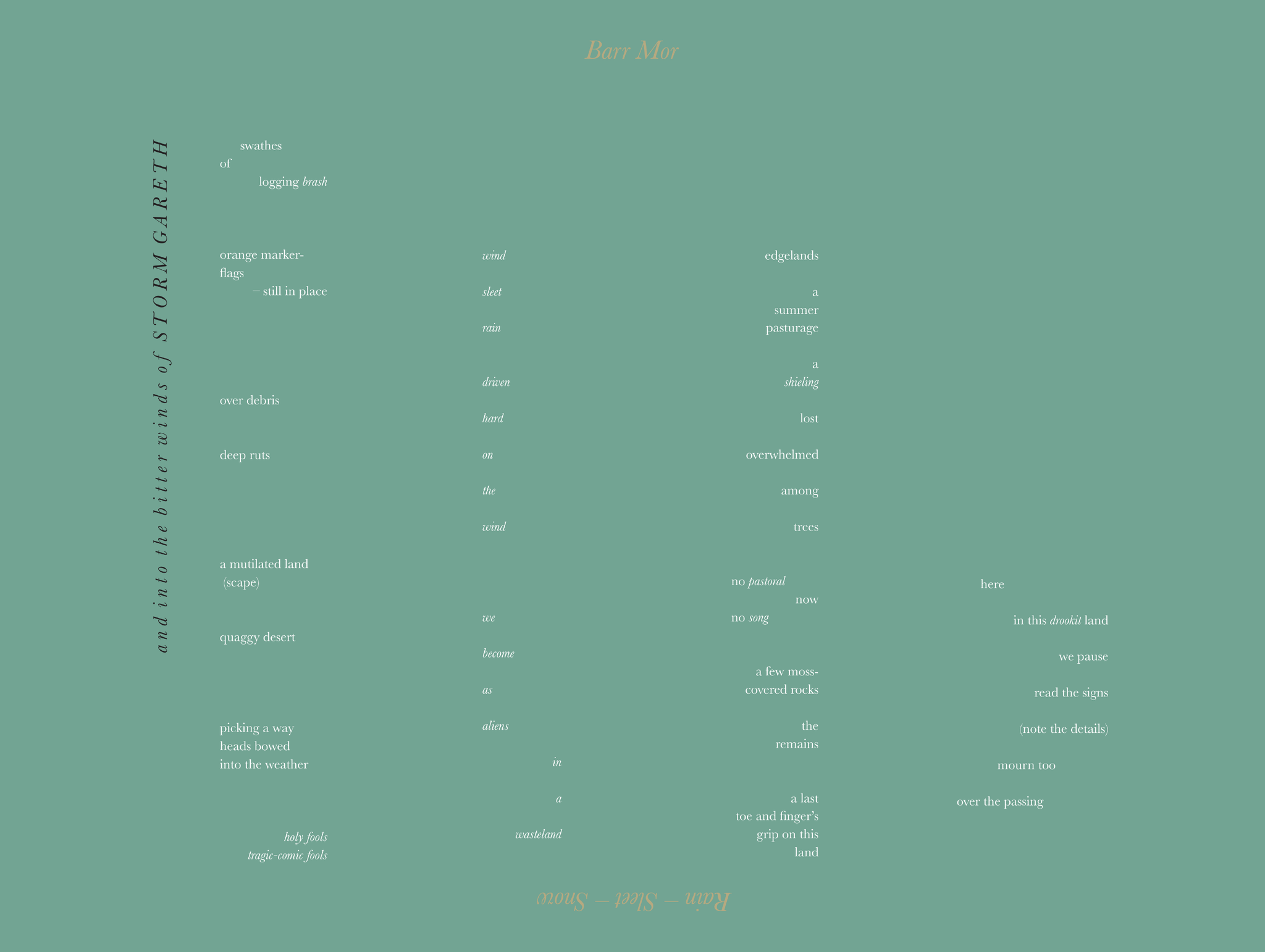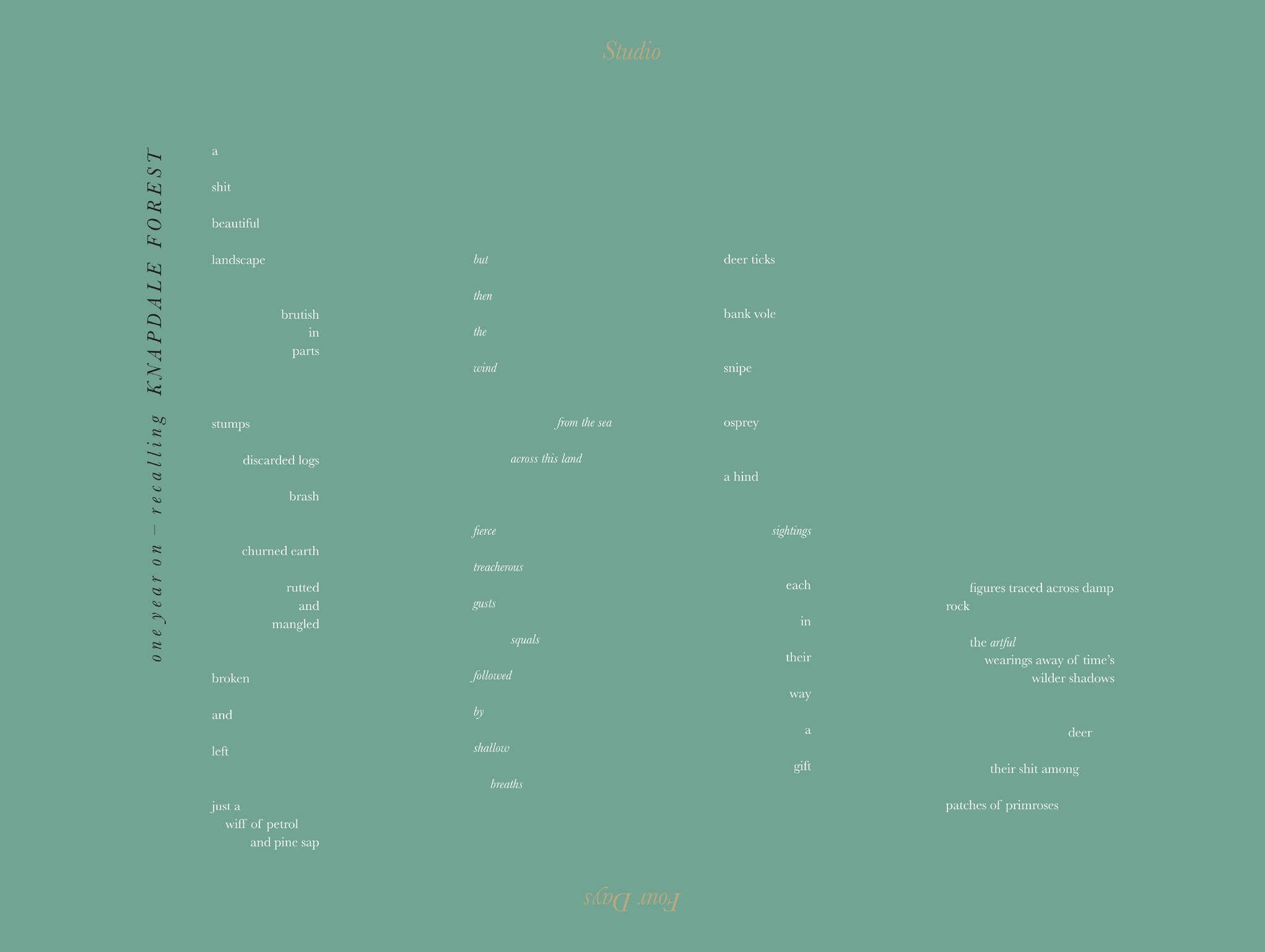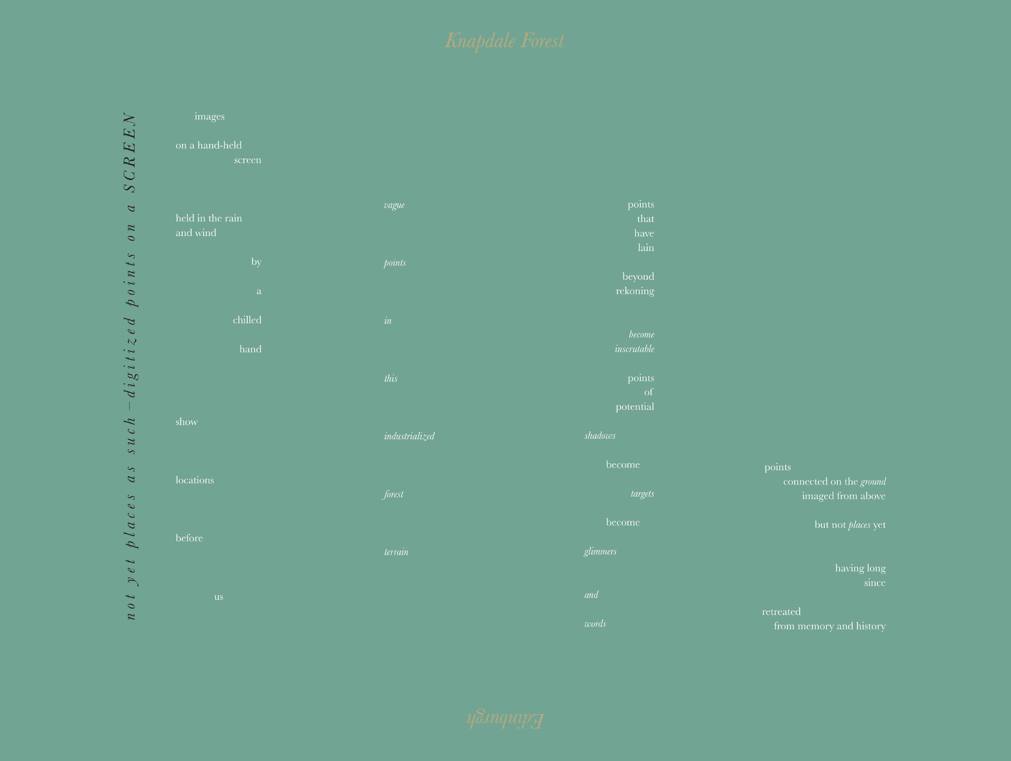 This exposition is based on an archaeological survey in the landscapes around Kilmartin Glen, Argyll and Bute, western Scotland, and references digital datasets – archaeological reference points –alongside the acts (enactments) of field walking, photography, drawing and poetry – experiences and representational discourses – to consider how land and landscapes may be read as dynamic palimpsestic and multi-dimensional fields of entanglement. Digital datasets were used by the survey to garner fruitful material to aid identification and to analyse (subtle) surface archaeological remains in the inhospitable terrain on the hills bordering Kilmartin Glen. By analysing, categorising and archiving such information, through naming and cataloguing, archaeological methodology effectively orders and tames such wildernesses. We, by contrast, are seeking to draw art and archaeological practices into dialogue with one another in order to assert the importance of recording experiences and random acts as a part of field research and, thereby, to both re-vivify and re-wild our encounters with landscape. Our exposition, and shared practices, intentionally encourage nuances of reading and interpretation that are found at the dialogic intersection between an artist/poet encountering archaeological landscape survey, and an archaeologist experiencing artistic, poetic and linguistic readings of land: reflecting in the process upon contemporary methodologies and underlying theoretical discourses. As such this research sits within the wider contemporary turn towards interdisciplinary practice, and seeks to establish a dialogue across disciplines; between humans and landscapes, practice and matter, that provides emerging approaches and hopes to remind us of the wild experience.