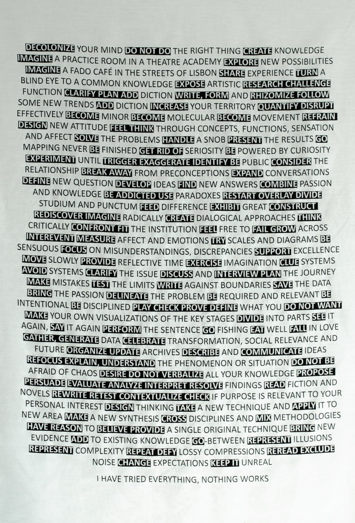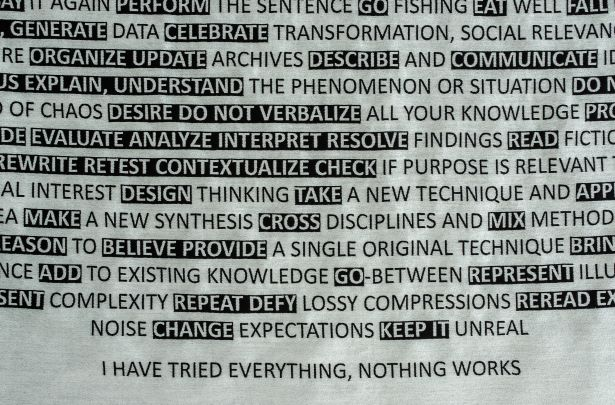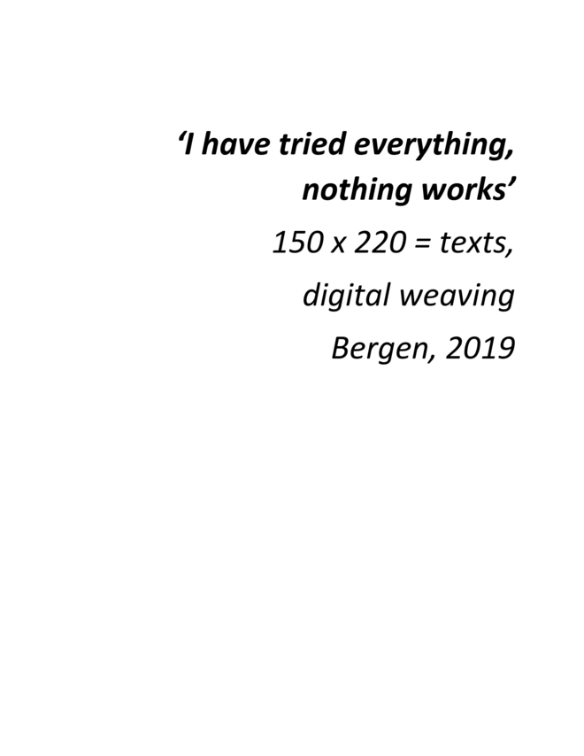 Victoria Mitchel tells that for Annie the articulation of threads as formation from and within and through interaction with the material gives a specific way to reading in which the threads are represented by the words which are used to describe them. / Victoria Mitchel, “Textiles, Text and Techne”, in: Textile Reader, ed. Jessica Hemmings, London: Bloomsbury Academic, p. 5-13.