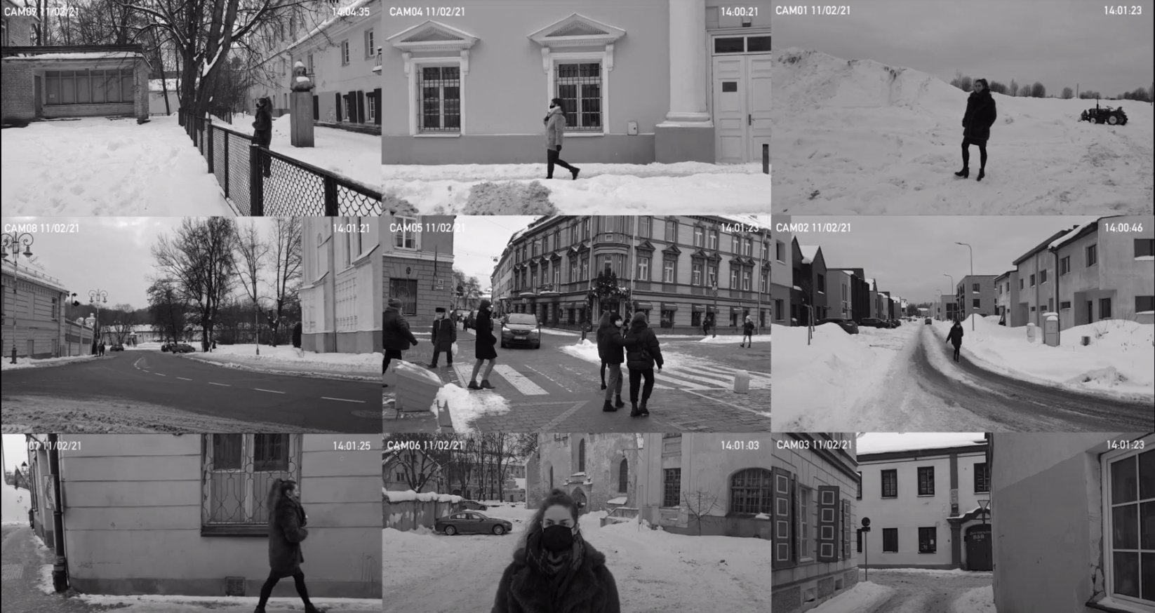 Šiame darbe vaizdas perteikiamas kaip saugumo kamerų imitacija - sukuriama aliuzija į realiu laiku vykstantį vaizdo kamerų fiksuojamą vaizdą. Kadruose galima matyti pasikartojanti tą patį asmenį - tai  buvimo keliose vietose vienu metu galimybė. Kiekvienas kadras turi unikalų pavadinimą ir skaičius, kurie primena laikrodį. Šie skaičiai juda chaotiškai - juda pirmyn, atgal, sustoja. Visa tai skirta parodyti laiko fiktyvumą ir atkreipti dėmesį, kad kognityviniai žmonių įpročiai nebepastebi tam tikrų dalykų - pamatę skaičius datos formatu jie nekreipia dėmesio į pačių skaičių teikiamą informaciją.