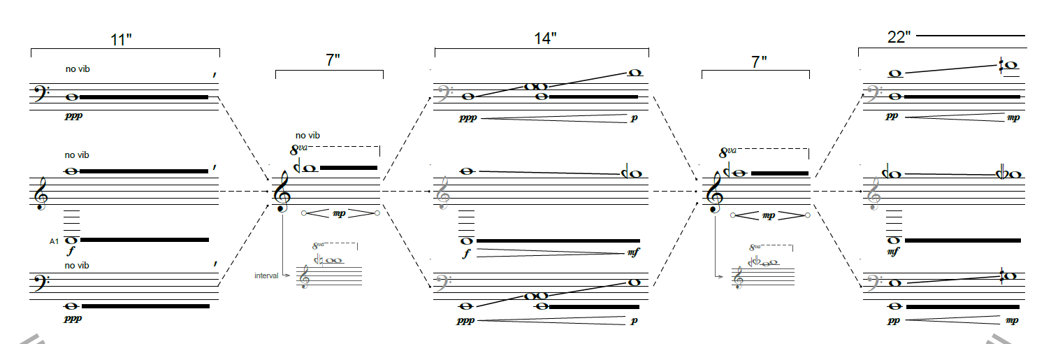 Filtered Reality, over the course of seven minutes, investigates the available frequencies (pitches, or, notes) in a given environment. Electronic recording software takes the performer's recording and, at specific moments during a live performance, filters the captured sound to highlight a single frequency. During a performance, a stopwatch is used by the performer to follow time-space notation (an alternative way of notating scores in a way that maps seconds instead of, more traditionally, tempo) so that they can accurately follow the field recording. The open score, shown in example 1, offers three directions for the double bass player to follow, as indicated by the dashed lines moving between each system. The performer is asked to consider the relationship between their instrument’s pitch and the filtered frequency of the field recording and, within seven seconds, decide which system they wish to continue playing. The player's decision is made based on the audibility of the two pitches (one pitch from the double bass, and one pitch filtered from the live recording). During performances of the work, the performer navigated different routes through the piece, responding to the changes in audibility from the locally captured sounds. Choosing multiple routes offered the performer an opportunity to take on a compositional role, and furthermore develop new relationships between their playing and the local sounds with each performance. The relatively simple task of taking a field recording, removing it from the original source material, and giving it back to the performer embedded within a musical composition allows me to redirect their attention towards other sonic qualities that may be glossed over during everyday listening. This technique personifies the type of listening that is important when challenging the functions and compatibilities of separate sound sources, as it offers us an opportunity to listen to real-world sounds artistically rather than instinctively. In other words, the very important responsibility our brain has of locating the sound of a car so that we do not collide with it changes in a performance space: there is the freedom to focus on its sonic properties whilst also developing an understanding for how these instincts might be affecting our cognitive abilities. In summary, this work looks to disrupt the social relationship and power dynamics between a performer, the musical material, the score, and myself in the creation of the score. It is principally concerned with how one might redefine the functions of sounds that are experienced passively, alongside sounds that are produced actively.