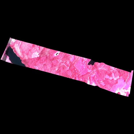 The satellite image taken by Sentinel 2 using a multispectral instrument on 7 May 2021 is 665.96 MB. The image, covering an area of 100 square kilometres, contains the reflectance map of multiple spectral bands. Each map records the intensity of a certain wave spectrum as reflected back from Earth’s surface to the satellite. Some spectrums are invisible to the human eye. Each image contains deep layers of information. The information of a map can be translated to a value in one of each RGB channel, which, when combined, form a colour image. This type of image is also called a false colour image because the optical layer is an interpretation of the data rather than the physical spectrum registered by the sensors. The red in a false colour image does not have a direct physical relationship with the world as we experience the colour red; here it signifies the reflectance of an invisible wave.