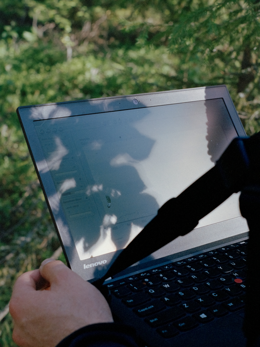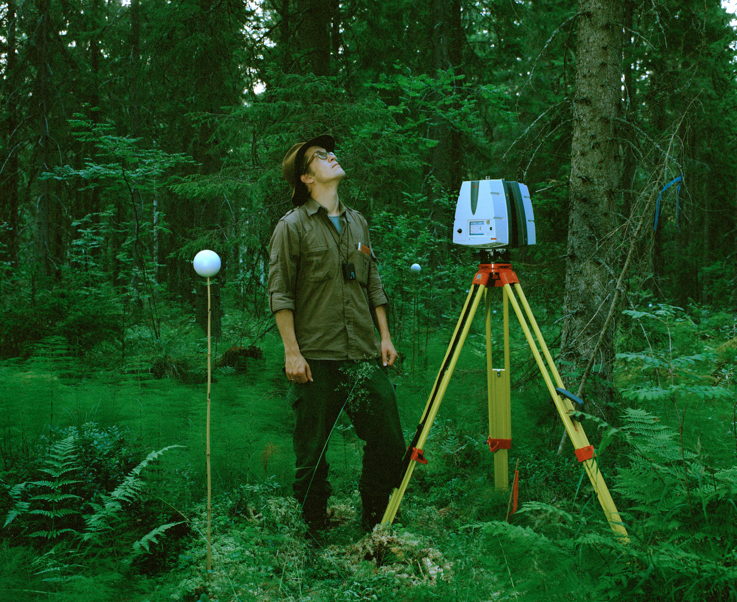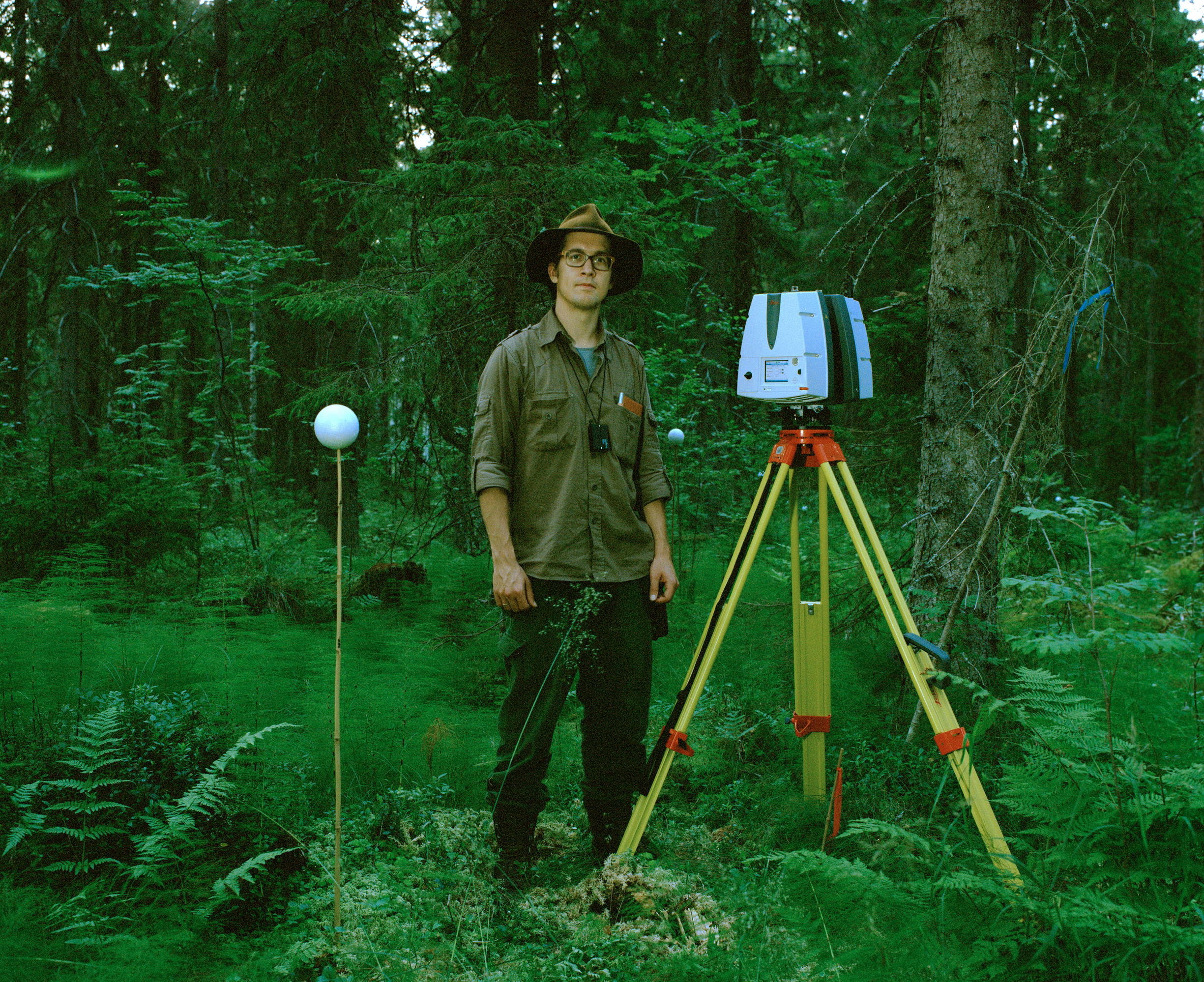 On a summer night, I took a photograph of Daniel conducting a laser scanning measurement on the forest floor. I was with him; I witnessed his fieldwork in person. The mosquito bites on my legs were my proof. The pixels on the digital scan of his portrait suggest the same evidence of the same event. The difference is that the photograph lasts longer; the bites fade away. The photograph also exists outside my body, becoming a proxy of my existence.
