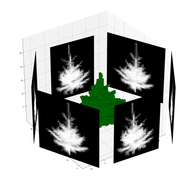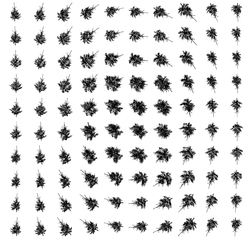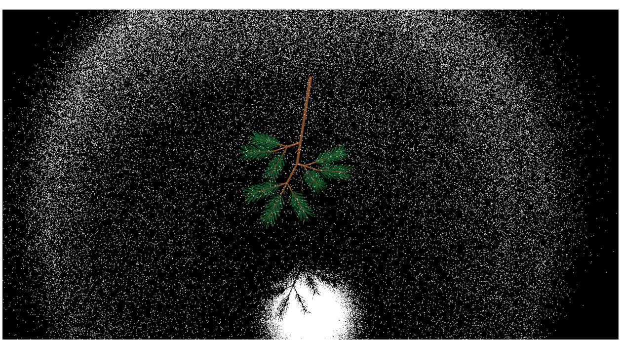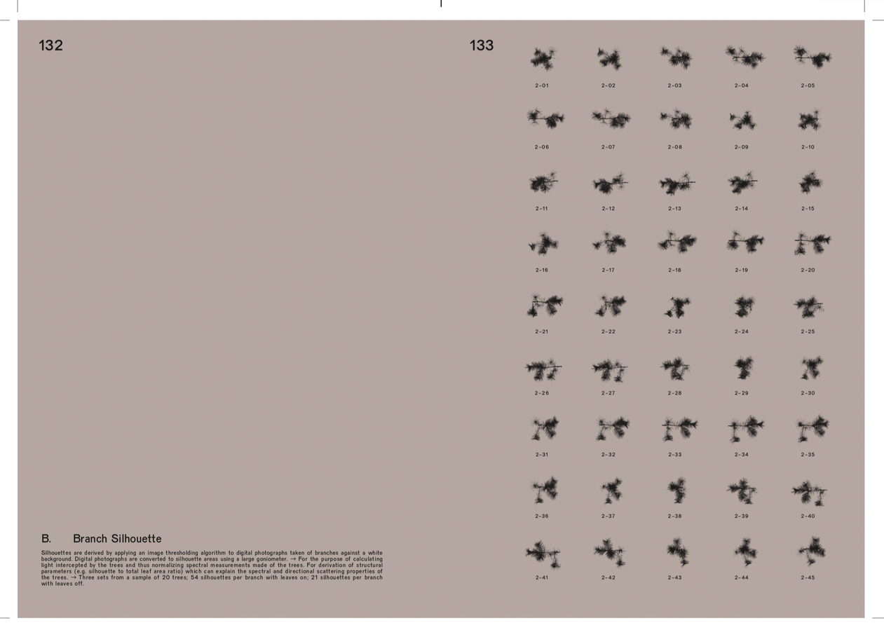 Daniel's point cloud, the laser scanner that produces it, the field trip we took to capture it and the research funding that supports it belongs to a social practice of representation I refer to as data realism. Different from photographic representation, however, this form of realism posits that the relationships between data formulated through mathematical operations represent our lived reality. Data realism is sustained by computational models. The common aphorism goes, 'all models are wrong, but some are useful.' A useful model has predictive power over reality. Models improve with more data and rigorous measurements. The point cloud of the forest is only one piece of the puzzle for the model called the reflectance model. By measuring the spatial topology of the forest, Daniel aims to formulate its mathematical correlation with the satellite's multispectral data. His colleagues meticulously measure the spectral properties of tree shoots under a goniometer to understand the way leaves reflect a certain band of electromagnetic waves.3 These measurements are recorded not only in photographs but also as point clouds, spectral graphs, and bitmap scans. And then the point cloud of the forest is only one piece of the puzzle for the model called the reflectance model. In fact, thousands of data points make up a reflectance model — creating a mathematical description of the interaction between sunlight and tree.4