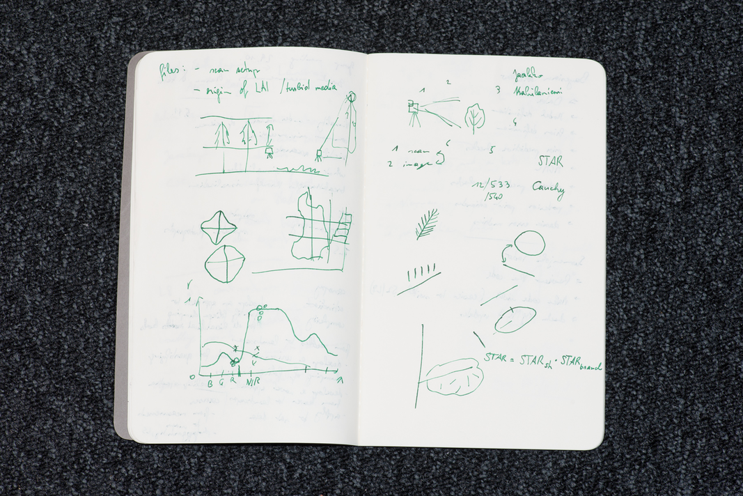 On this summer night, Daniel and I are standing on a forest plot at Hyytiälä field station in the middle of Finland. We are both observing from the ground level, but for different reasons. Daniel belongs to a team of remote sensing researchers led by associate professor Miina Rautiainen. The official aim of their research project, ‘From needles to landscapes: a novel approach to scaling forest spectra’, is to develop a better model for the interpretation of multi-sensor satellite images of forests (Hovi et al 2019). Remote sensing is the technique of near real-time environmental monitoring using open access data without on-site observation (Schraik 2022: 15). Remote sensing frequently refers to planetary observation. For instance, the Opportunity Rover, equipped with a panoramic camera capable of photographing a scene with thirteen colour filters, was designed as a remote sensing endeavour to explore the extra-terrestrial landscape of Mars. On Earth, orbiting satellites collect data on environmental elements from surface temperature to vegetation coverage through multispectral sensors. The network of satellites forms a planetary sensorial system monitoring Earth in real-time. Each satellite imagery is telepresence: relaying the top-down view once imagined as a supernatural power, now becomes accessible to the human eye.