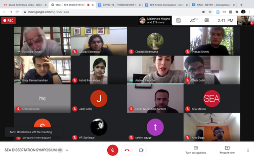 In the frame above we see along with students and faculty at SEA, the two invited reviewers Bijoy Ramchandran from Bangalore, Andrea Pinochet from Hong Kong University speaking from her home in Oslo and an unknown figure right in the center of the screen Kardo Norradin Karim,