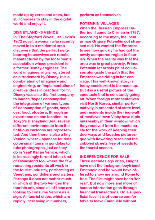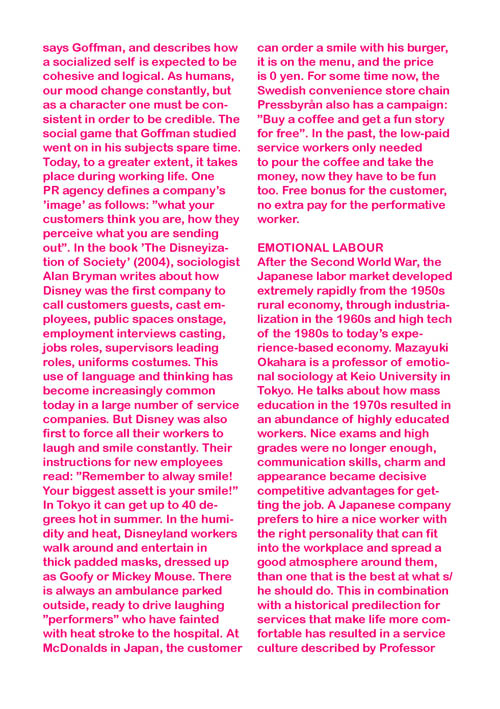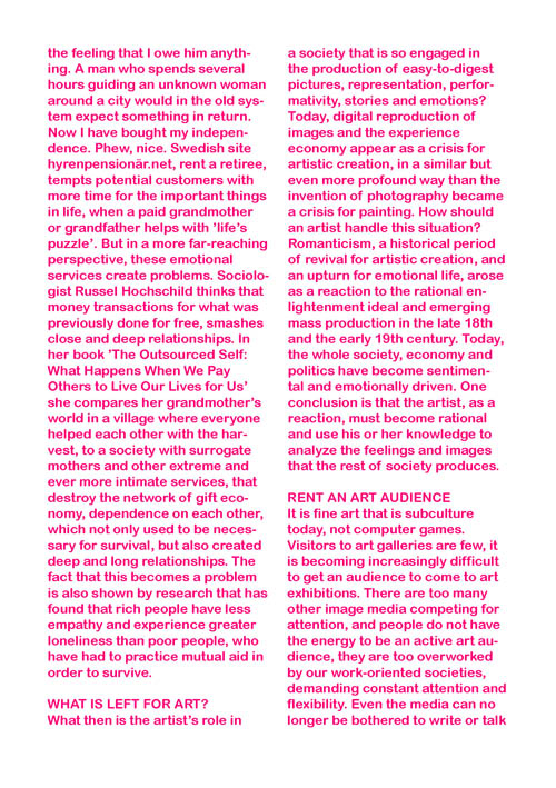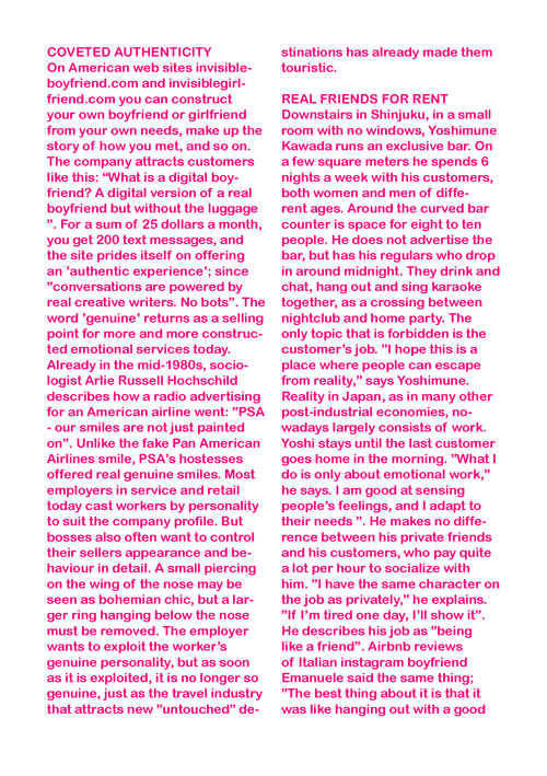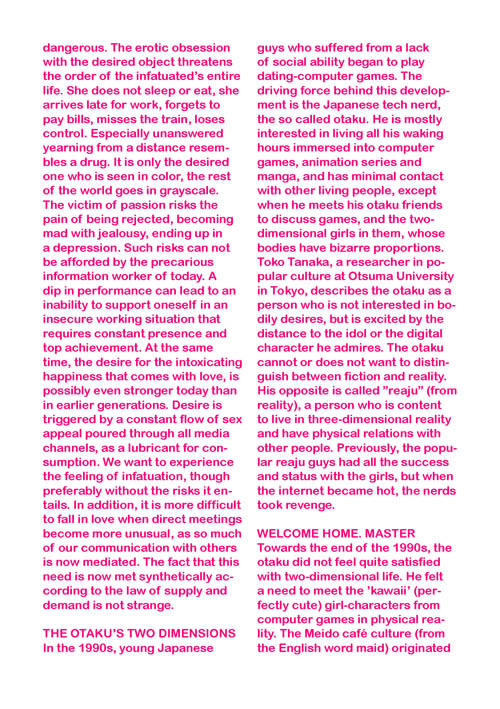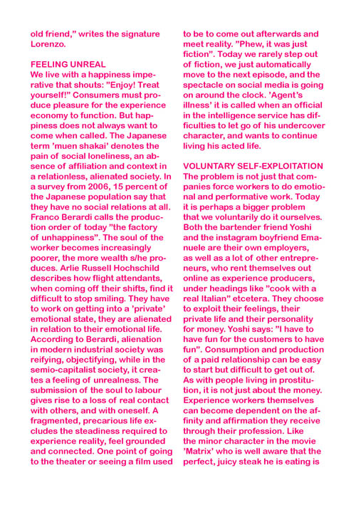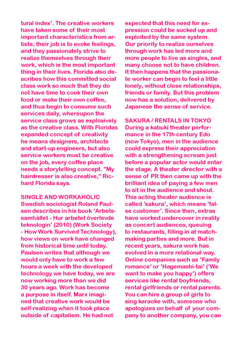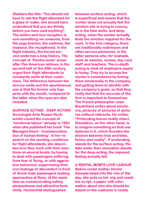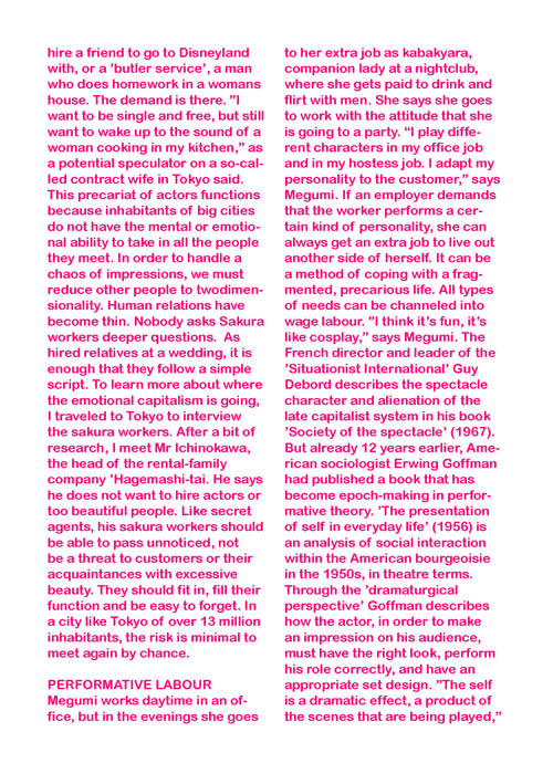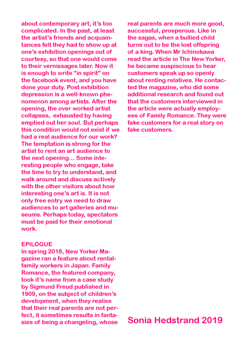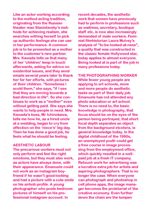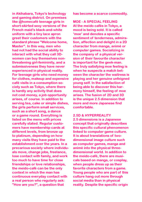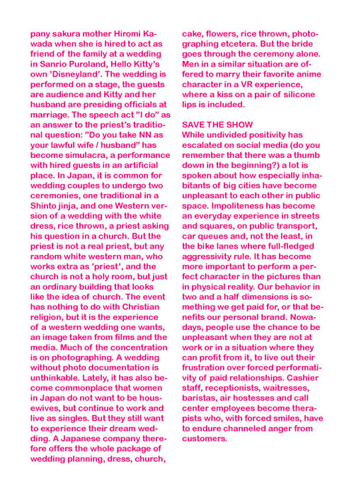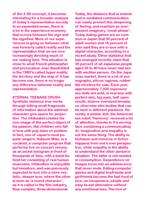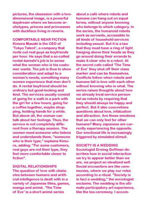 Three-dimensional life is the complicated physical reality where we work, miss the bus, get sick, are let down, feel unseen and become depressed. Two-dimensional life is the exciting, beautiful, dramatic, entertaining and flat world of pictures, TV series and computer games. Where everything is much easier, and where we choose to spend more and more of our time. What happens when the boundaries between the two-dimensional and the three-dimensional worlds are blurred? When everyone uses filters to look better and only post about their successes but no setbacks? When you can marry your beloved anime character in a VR game? When you can rent a partner who is always happy? The research project ‘Life in 2.5 dimensions’ is a reflection on how the increased degree of representation and performativity professionally and socially is related to the development of global experience capitalism, and how an escalating consumption of games and social media affect our relationships and emotions. In animated and documentary videos, we get to know a type of Japanese workers called ”sakura”, which means "fake customer". These are people who work with renting out their emotions. They support themselves by acting as family members, partners, dates, or friends in physical reality. The work analyzes a societal situation in post-industrial economies where community and belonging can be purchased in the form of performative, aesthetic and emotional service work.