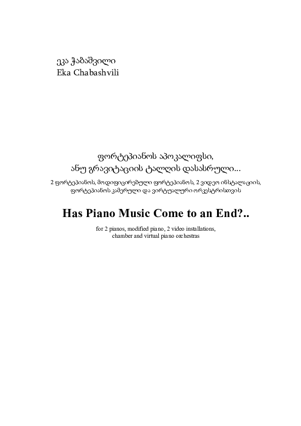 What you see and hear now is actually a piano chamber orchestra recorded by two pianists. Nino Jvania and Tamar Zhvania play parts of 12 pianos that are written out in the score. The parts represent improvisations based on musical material and sound-production techniques offered by the composer. This video is to be projected on the screen, and pianists are supposed to perform two solo parts live in ensemble with the piano chamber orchestra.