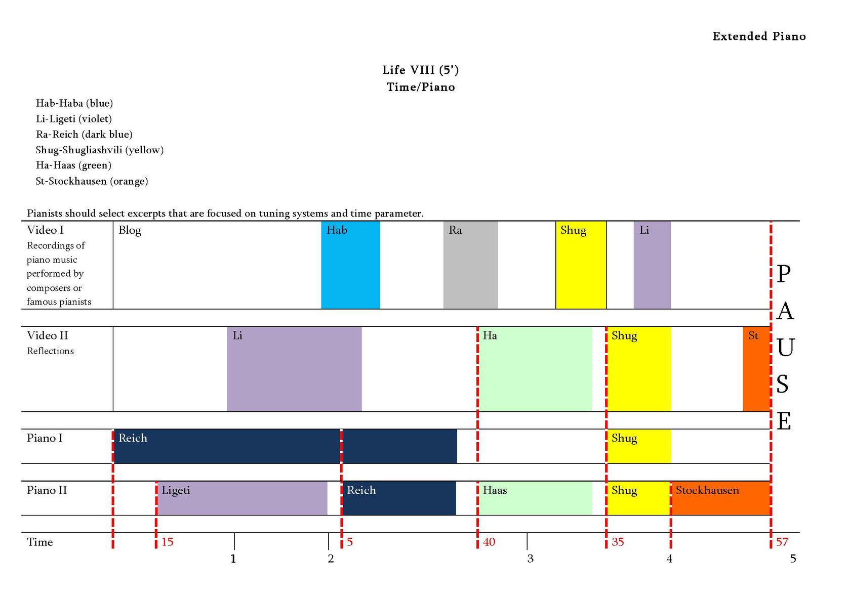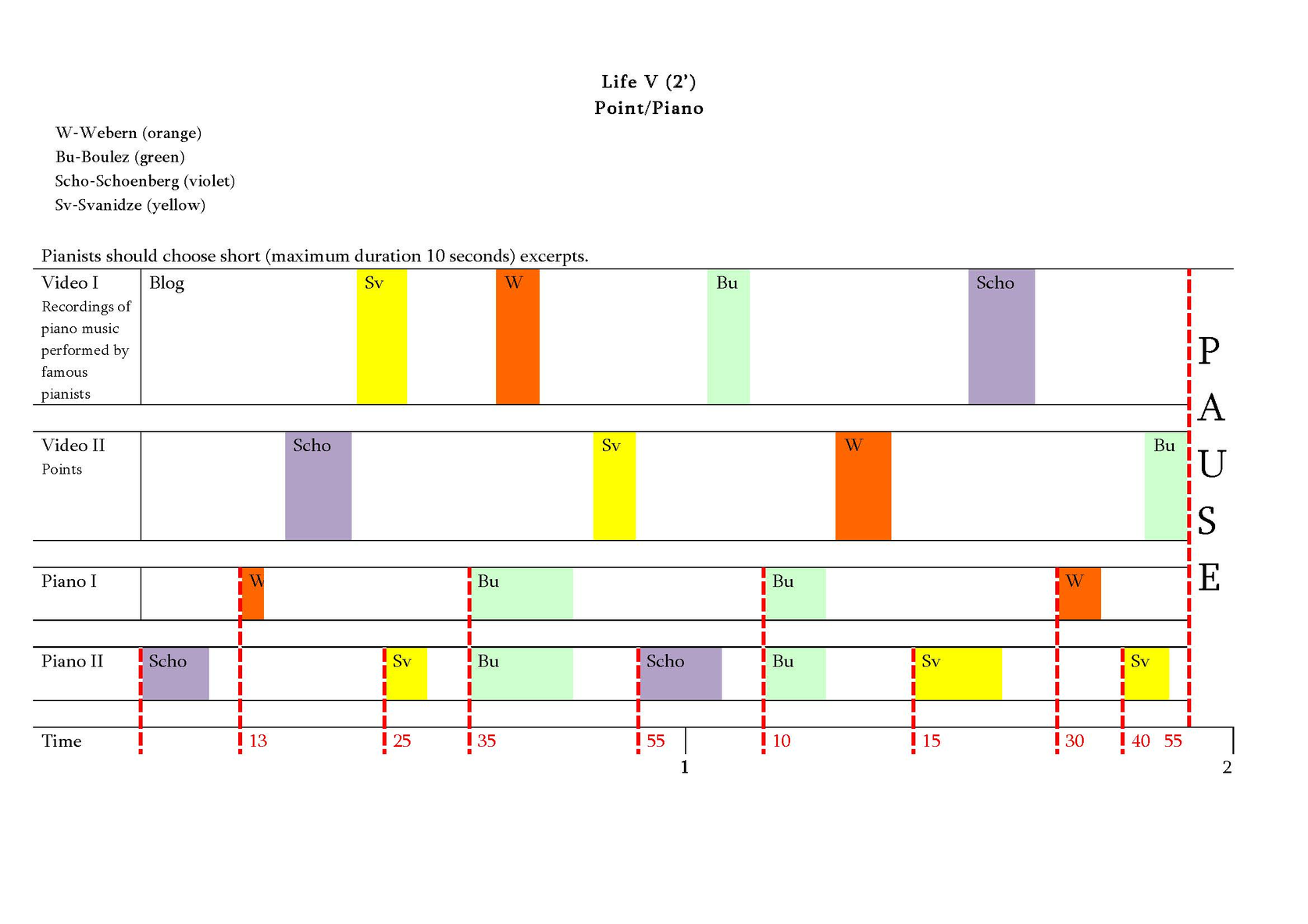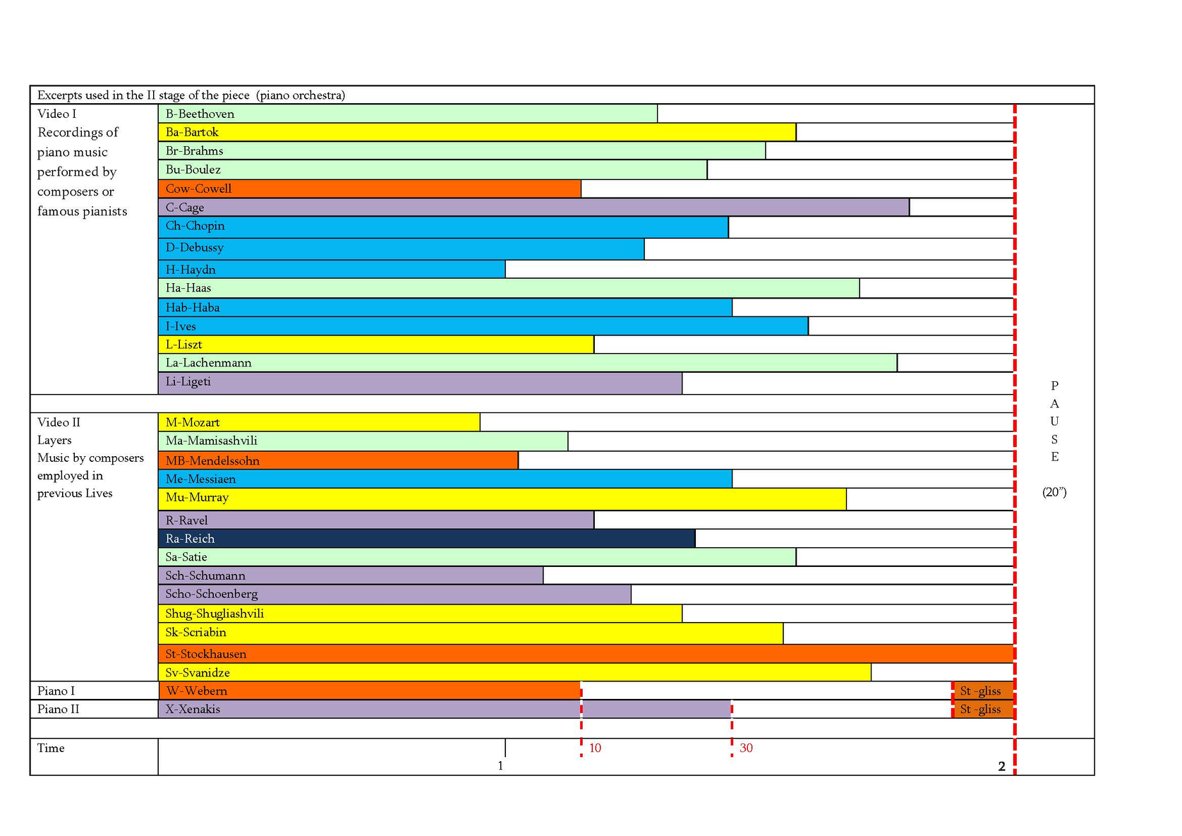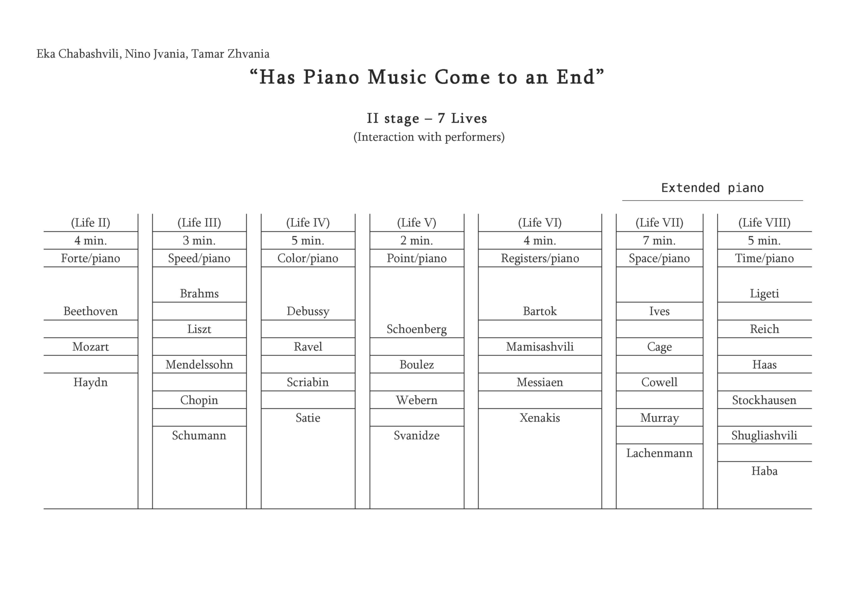 We consider the history of piano music as a cycle consisting of several lives. Life, according to Eka Chabashvili, is a time-bound phenomenon, representing one of many phases of existence and it is constantly changing in a multiple time and spatial dimensions. Each life consists of invisible gravitational waves that pass through one phase of time and space and then disappear... Then new waves arise, creating a new phase of existence and a new life emerges. Thus, eternity is a sequence of those phases. The transitional period between the phases is the Apocalypse. The Apocalypse is a kind of the end of gravity, the longing for the end and the beginning of the new phase. Thus, Stockhousen’s announcement could be connected (at least, by us) with the Idea of the Apocalypse and longing for it. Actually, Chabashvili interprets particular scientific theories (in this case – the theory of gravitational waves) in a quite free way, as an artistic idea that serves as a foundation of the construction of the piece.