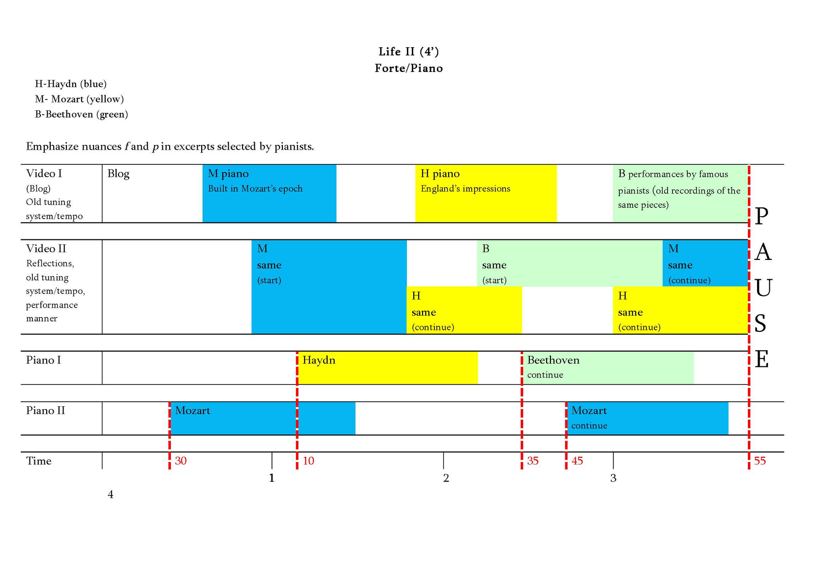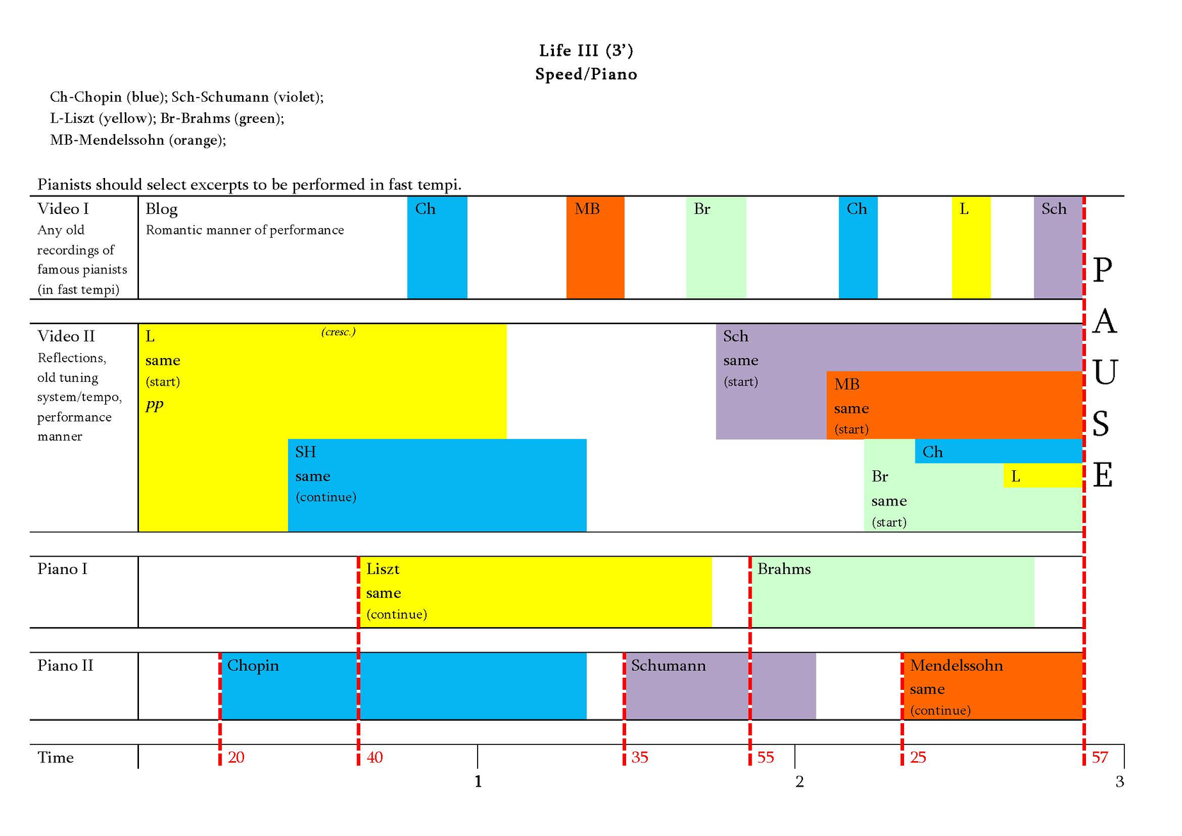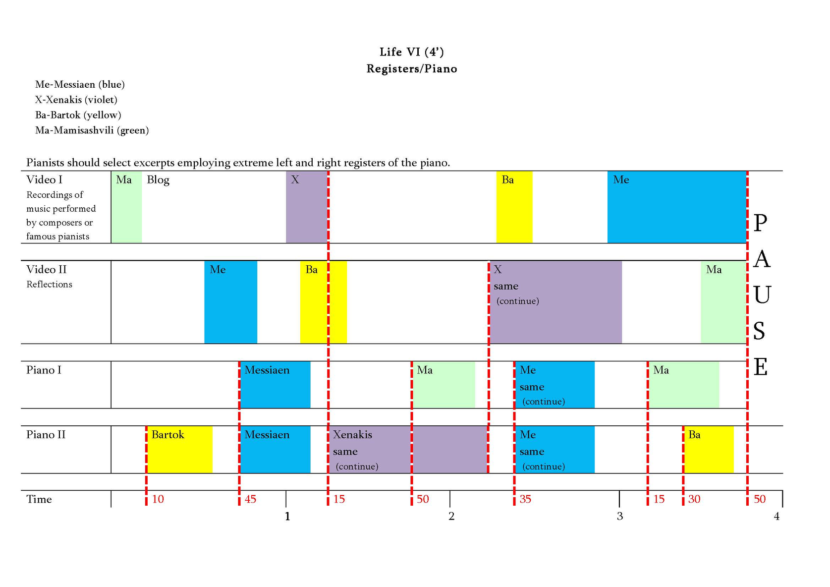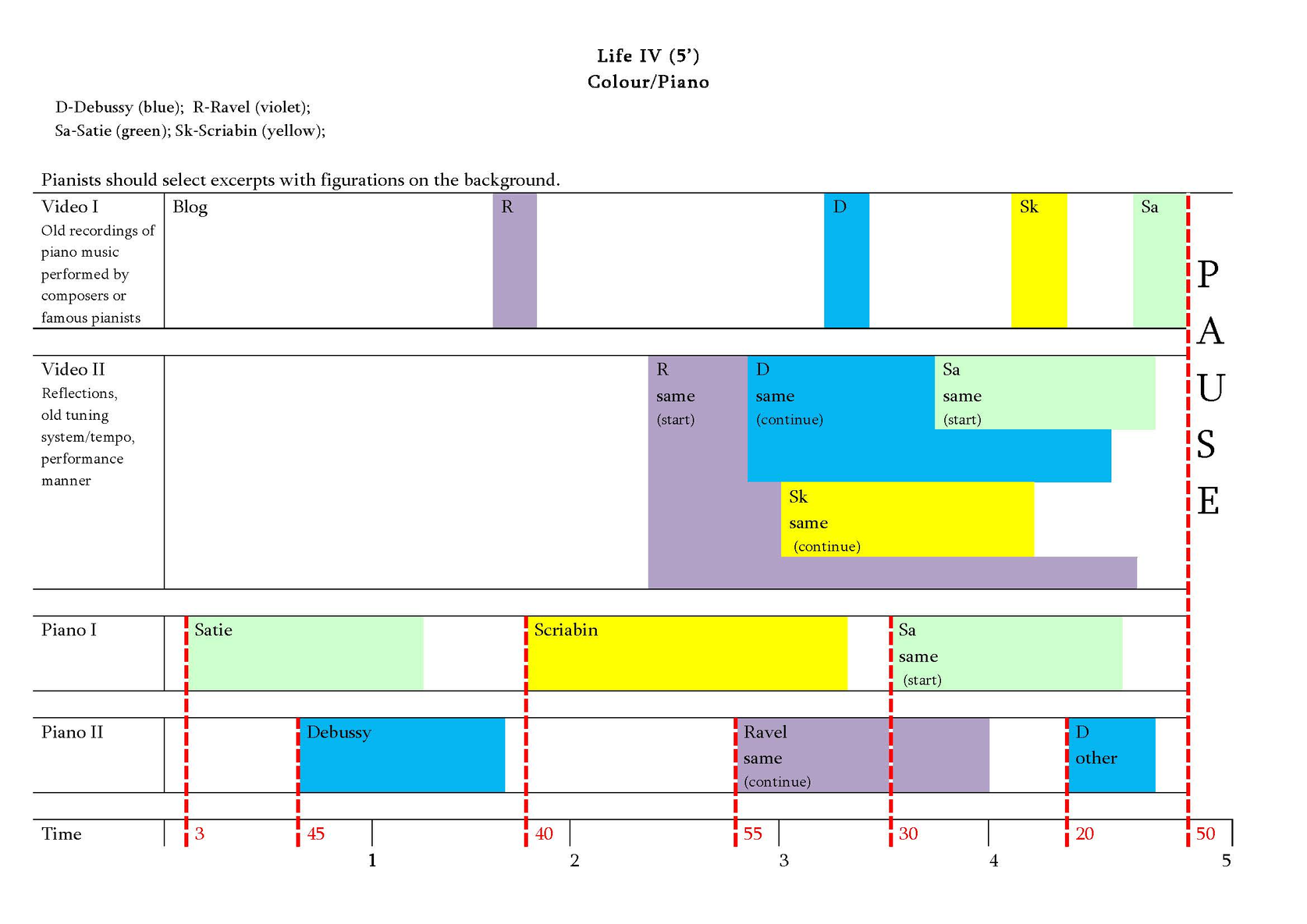 We consider the history of piano music as a cycle consisting of several lives. Life, according to Eka Chabashvili, is a time-bound phenomenon, representing one of many phases of existence and it is constantly changing in a multiple time and spatial dimensions. Each life consists of invisible gravitational waves that pass through one phase of time and space and then disappear... Then new waves arise, creating a new phase of existence and a new life emerges. Thus, eternity is a sequence of those phases. The transitional period between the phases is the Apocalypse. The Apocalypse is a kind of the end of gravity, the longing for the end and the beginning of the new phase. Thus, Stockhousen’s announcement could be connected (at least, by us) with the Idea of the Apocalypse and longing for it. Actually, Chabashvili interprets particular scientific theories (in this case – the theory of gravitational waves) in a quite free way, as an artistic idea that serves as a foundation of the construction of the piece.
