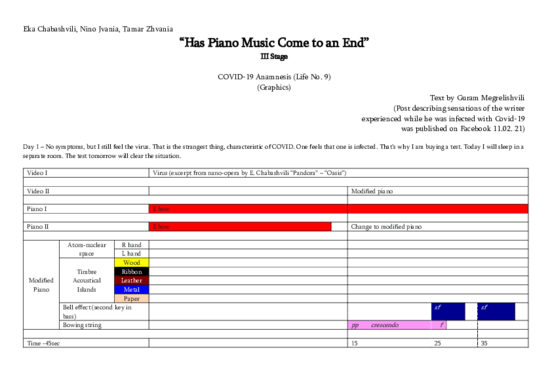 The third stage (duration 15 minutes) represents Life No. 9 – Covid-19 Anamneses depicted with the help of Modified Piano ModEkAl. The central role in this stage is played by the instrument developed by Eka Chabashvili in cooperation with a piano master Alexander Zirakashvili. Though, Chabashvili engages also two acoustic pianos which are played in first two stages.