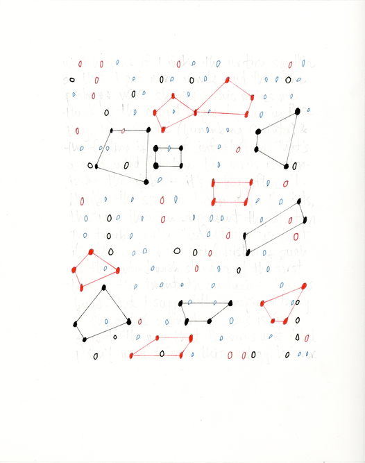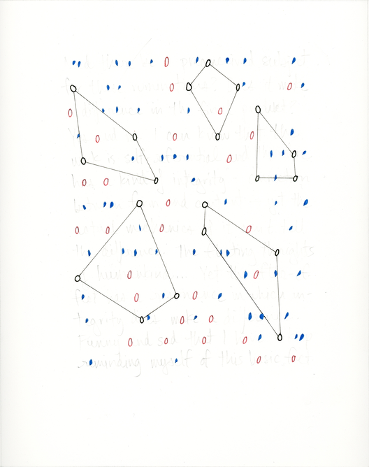 I emphasize the process of ideation not only by erasing the words, but by making obviously idiosyncratic shapes. The shapes may look solid, but their outlines are provisional. I could connect the same dots to form different shapes, or I could connect different dots. No consistent rules govern the process; sometimes one drawing suggests new guidelines for another. Often, I look at an array of dots/data for a long while, without a plan in mind for how to draw the lines, so that an idea can occur to me, and hopefully surprise me.
