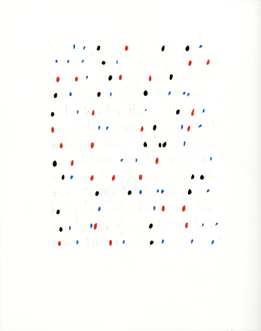 At least I shifted the formal parameters of the project, to amplify the conceptual theme. I increased the paper size to 10 x 8 inches so that these dimensions would resemble those of a piece of writing paper. And I chose a palette of black and white, red, and peacock blue. In both manuscript and print traditions, this color combination appears in the texts that have enabled the transmission of ideas. In many medieval manuscripts, bright red and lapis blue are key colors, and their electric juxtaposition conveys underlying themes that inform the texts. More recently, in graphic design layouts just before the computer era, red registered as black, and light blue registered as invisible in some photographic processes.