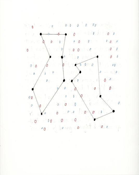 Sometimes I try to invite possibilities by distracting my attention, for instance listening to a podcast while working. This occupies my cognition so I can indulge my visual inclinations more freely. It also revisits the experience of drawing during the height of the pandemic lockdown, almost a year before this, when my attention was distracted by consistent confusions, concerns, and input streams. Drawing, then as now, enables me to gather and organize the frayed threads of thought. In this context, we may think of the field of dots as an explosion of data into a stormcloud of disarray. Connecting them offers a more coherent, shapely alternative to a distracted state of mind. Perhaps, altogether, the contagion of ideas is triggered by the appeal that any structure offers to the consciousness. We gravitate toward the ideas that give our individual minds varieties of reassurance that we crave, forms we can inhabit.