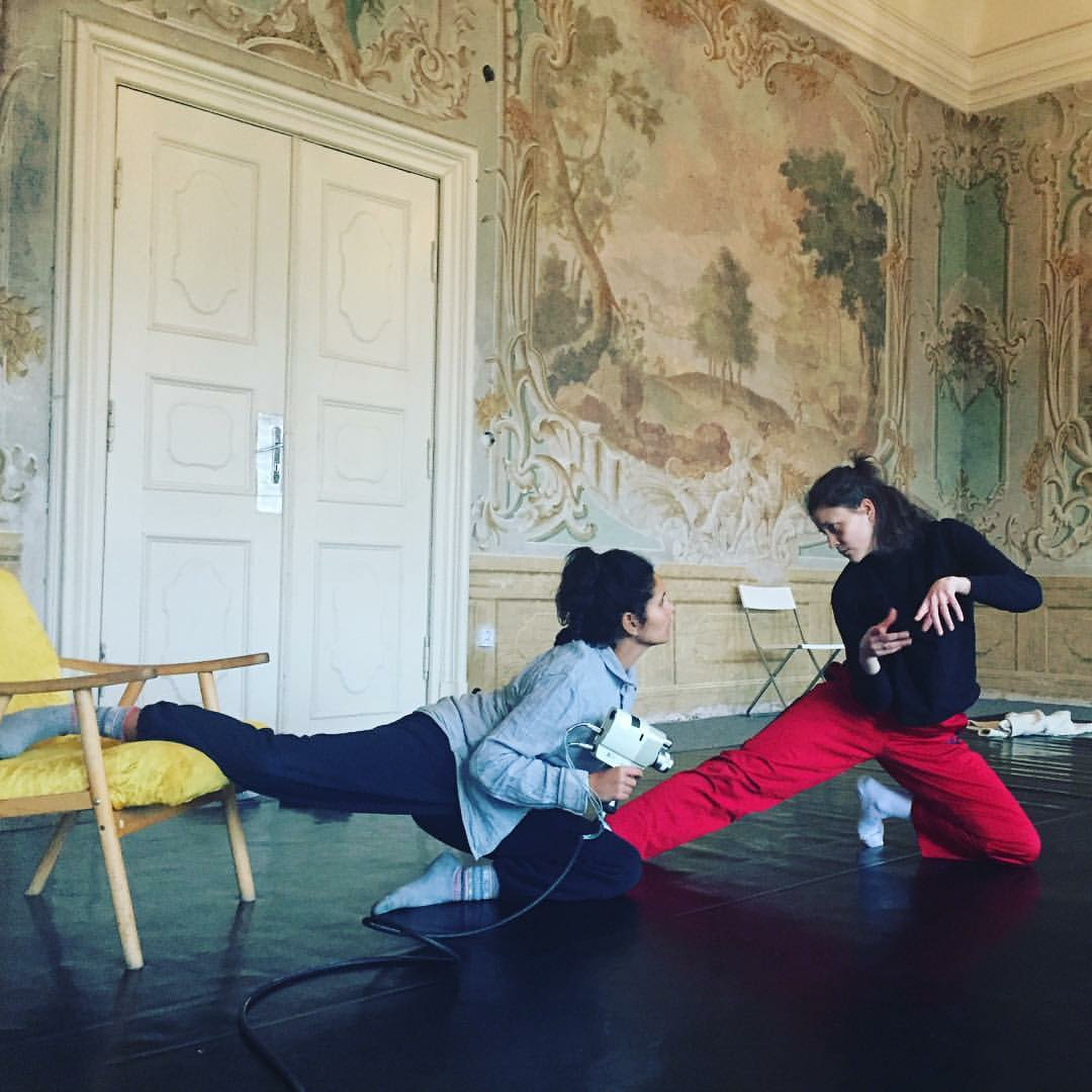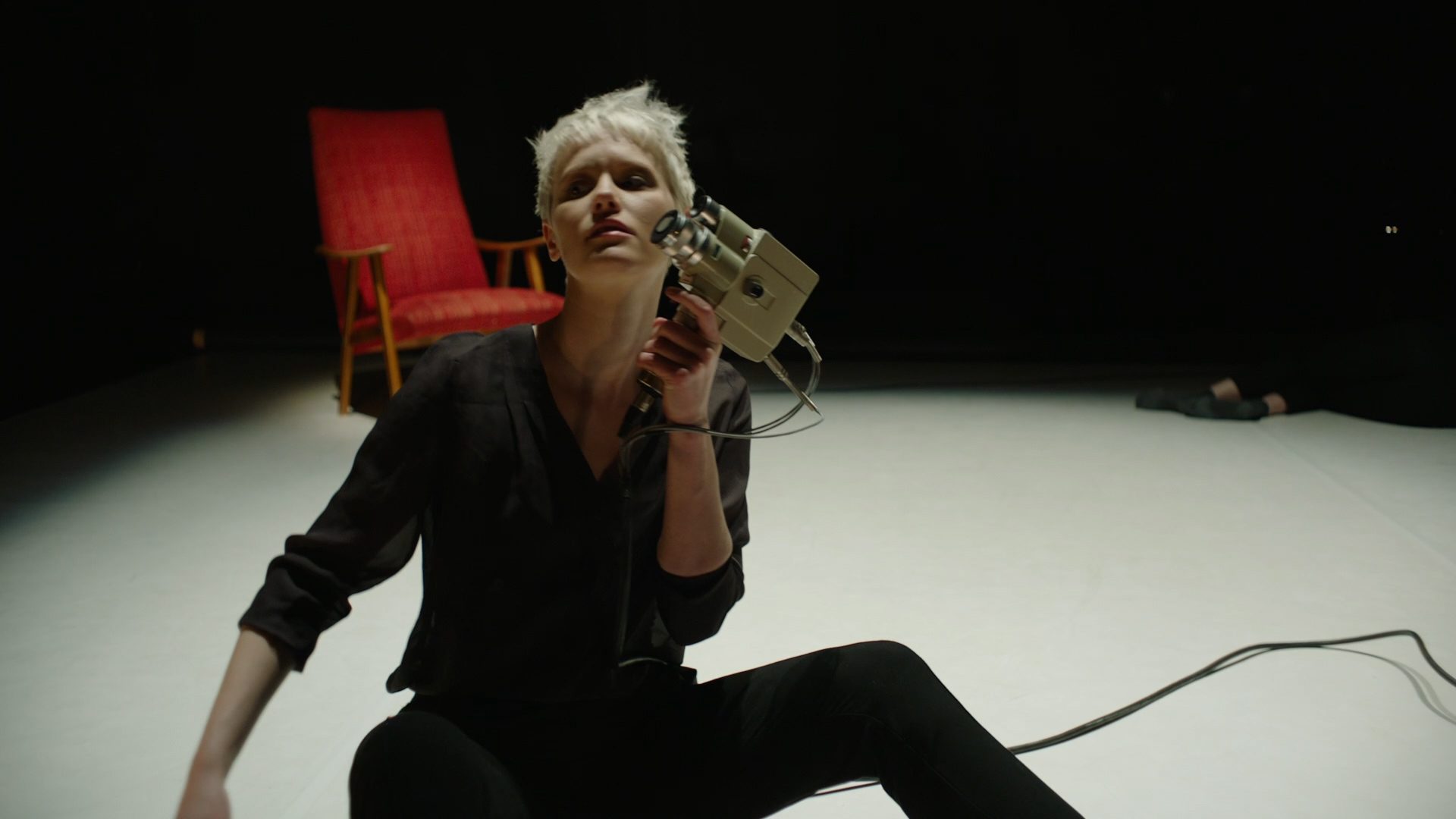 The visual iconography of the film camera was also reflected in the choreography. The Looping Camera was used in a duet between the two dancers. A starting point for the choreography was that the dancers in part would recreate something that resembled an interview situation: one dancer directing questions and then recording/filming the answers from the other. While the interviewer records herself talking backwards then reversing the sound to uncover the sounds’ linguistic meaning, the dancer answering is silent, only attempting to express herself through movements and strange gesticulations. Turning the duet into an unexpected and incomprehensible dialogue commented upon the relations we expect between sound and meaning.