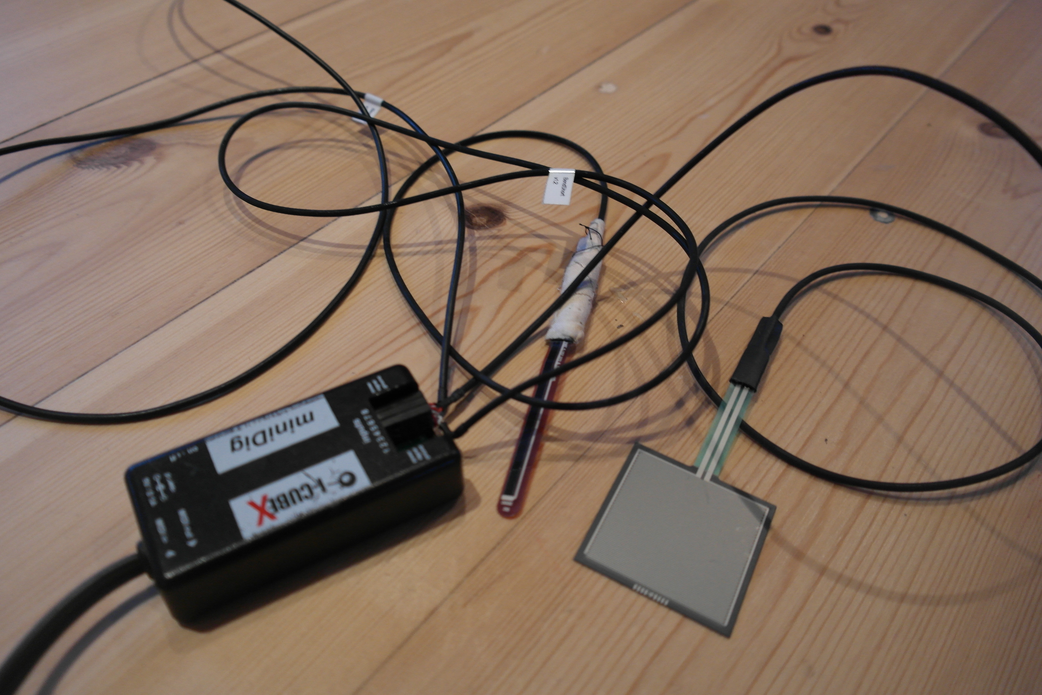 The contact microphones on the floor were used in a part of the performance where the dancers were lying on floor moving in synchronization with small, abrupt movements. The contact microphones picked up the slighter movements the dancers made and in addition to just amplifying the sounds we used the signals to trigger other crackling sounds. Gradually, as the dancers moved faster and faster, the crackling sounds grew more intense and new, more tonal, electronic sounds were added.