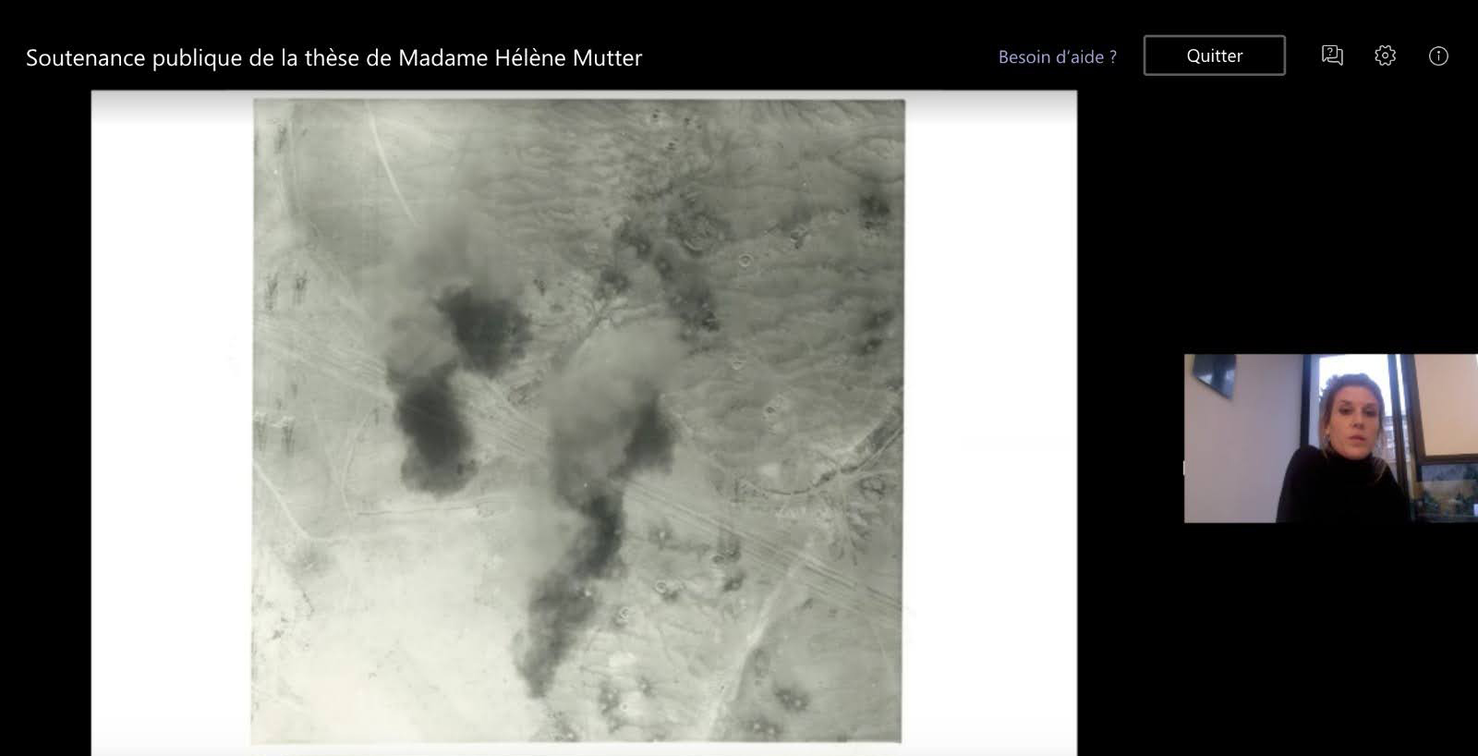 Insert military pictures in the field of art and creation is something indicative because its permits to make uncertain nature of war photographs evident, inability to understand and illusion to understand events around us. To understand an image and understand what we see of and in the image requires to educate our eyes. This is particularly that dimension which calls to my mind with archives from the First Gulf War. Abstract pictures, grey, taken by plane, I was totally unable to decipher and analyse them, because aerial view seems to prevent to see war reality. I was facing documents which were only reserved to specialist, produced in a military context, by military machine and for military expert. For him, the document has a usefulness he needs to grasp, media transform the document in picture, while the artist shows us deprivation of the world in front of a strangely quiet surface.