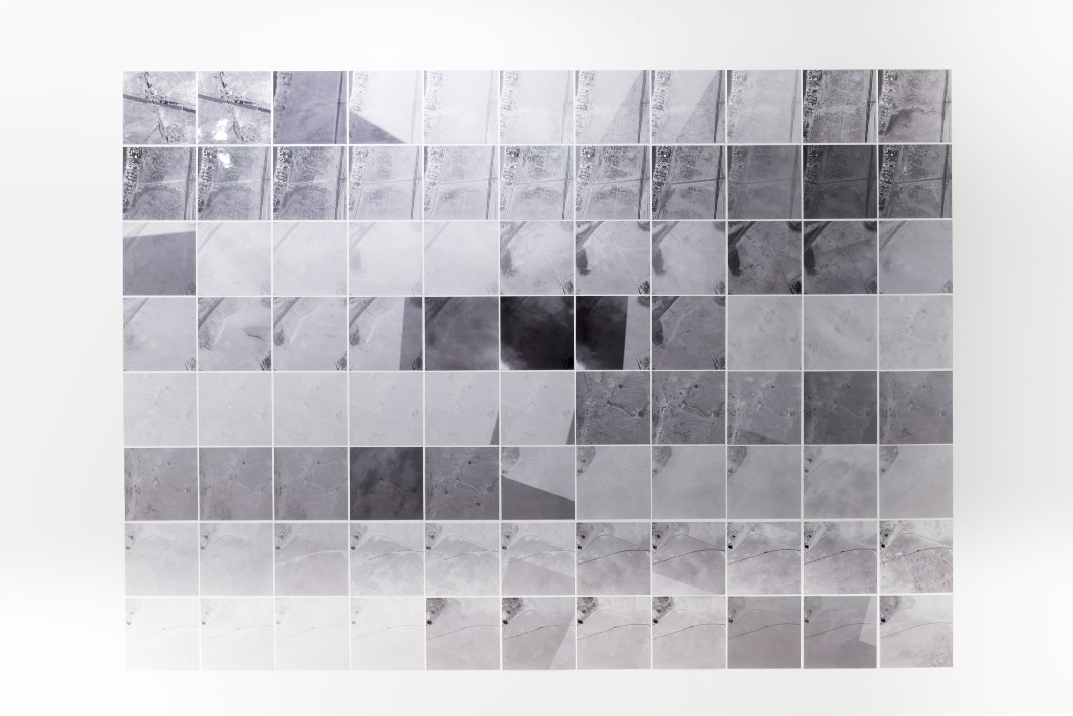 "Before & After", 88 images from Google Earth software program, digital prints, 269 x 195,5 cm, view of the exhibition "La guerre imag(in)ée" at Peinture Fraiche gallery, Brussels, 2017.
