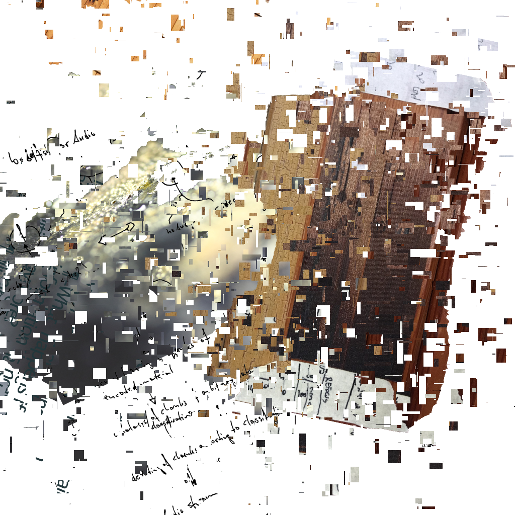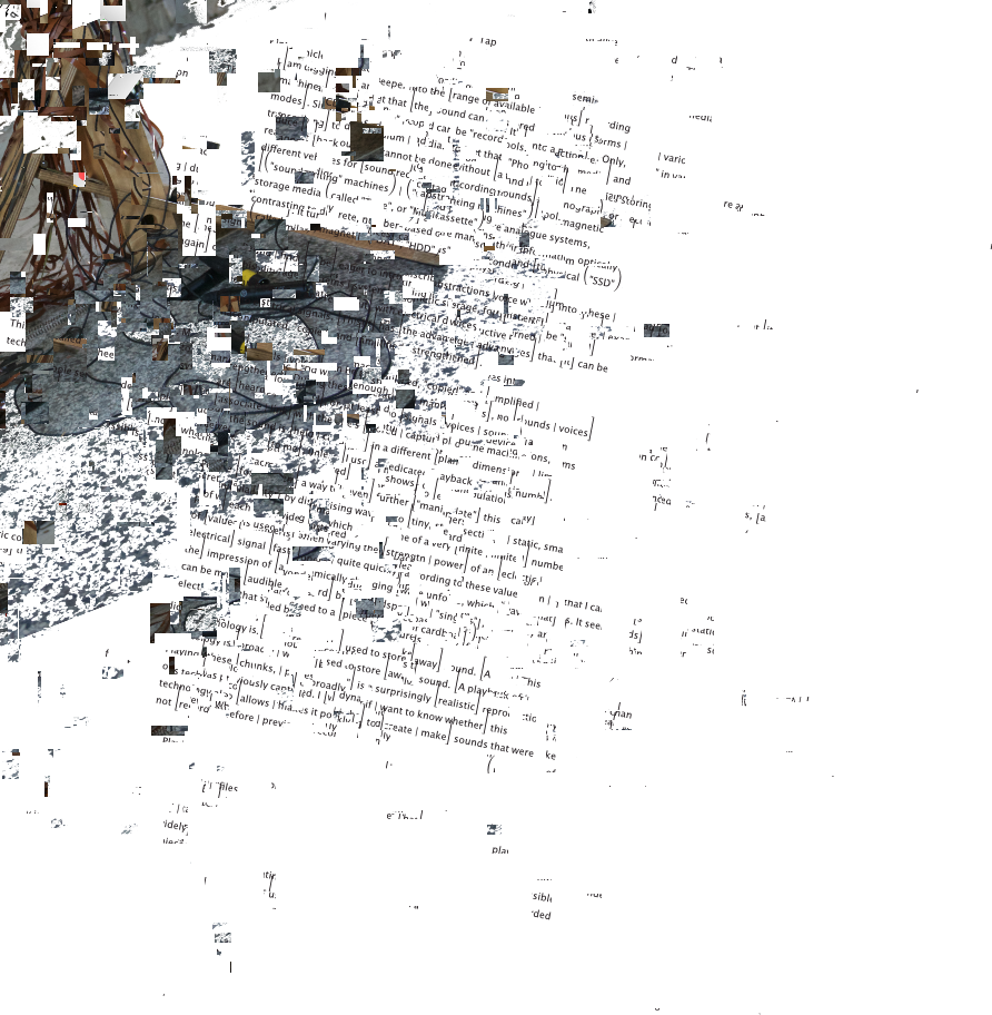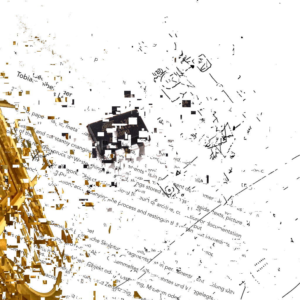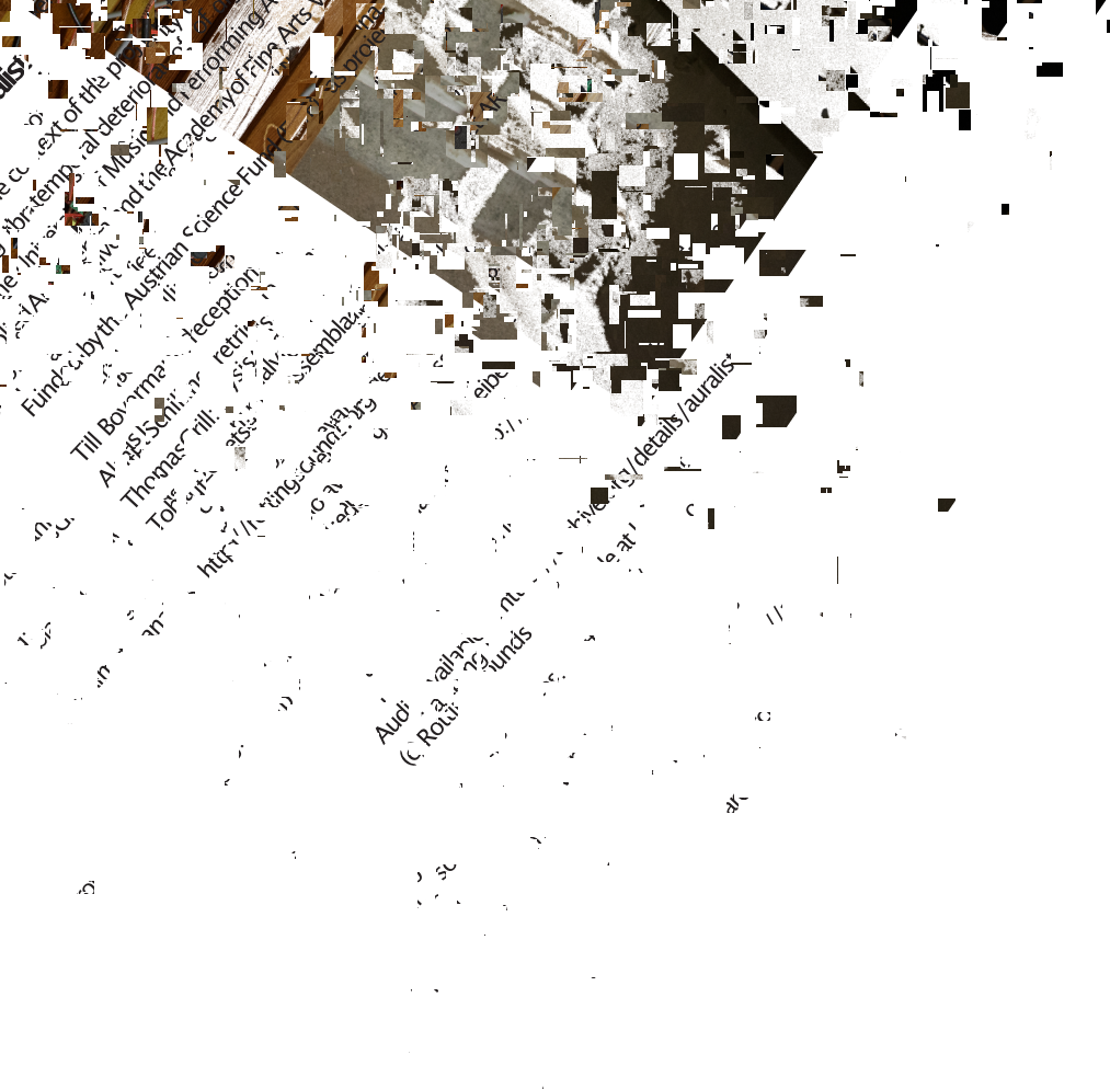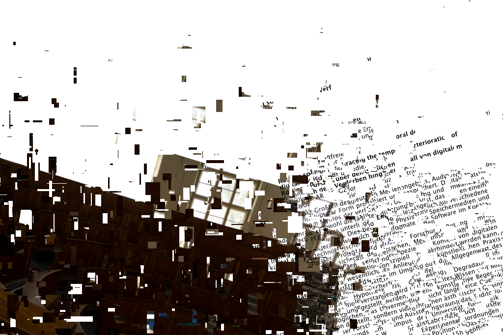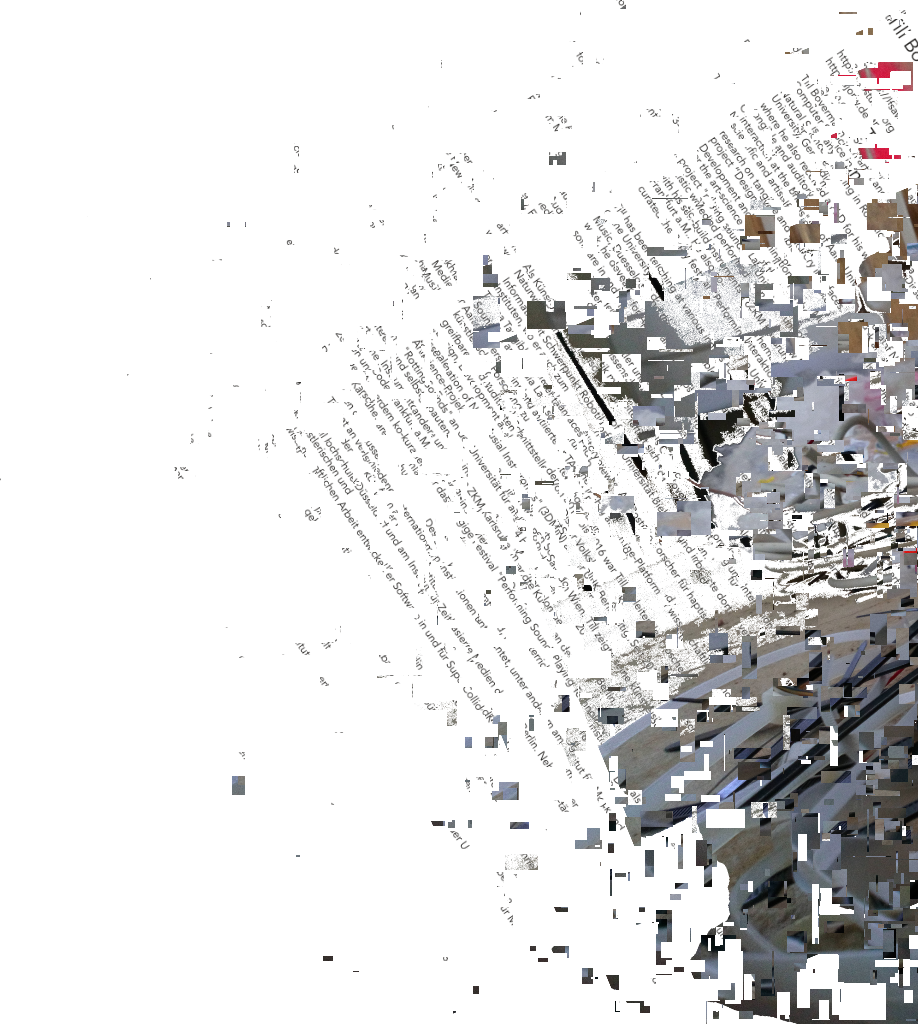 The processual sculpture "Fragments" is in permanent development and consists of artefacts of the "Rottings Sounds" project of artistic research*. Waste, things collected, things stored and things put aside, texts, pictures, data, sounds etc. are the basis of the shape-changing work. It is located at the Auditorium of Rotting Sounds. For this exposition, media representations of physical fragments have been arranged, then subjected to multiple stages of erosion processes specific to digital data. Object or exhibition, museum or archive, collection or documentation are moments of intrinsic research and decomposition, accompanying the process and resting in the distant but immediate eye of the virtual observer. *"Rotting Sounds – Embracing the temporal deterioration of digital audio" is a cooperation of the mdw – University of Music and Performing Arts Vienna, the University of Applied Arts Vienna and the Academy of Fine Arts Vienna. It is funded by the Austrian Science Fund (FWF) as project AR445-G24.
