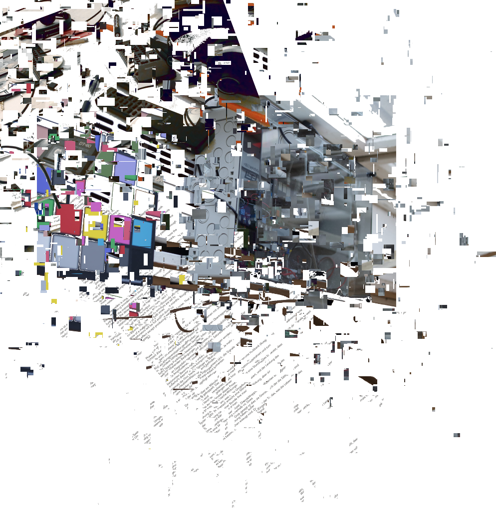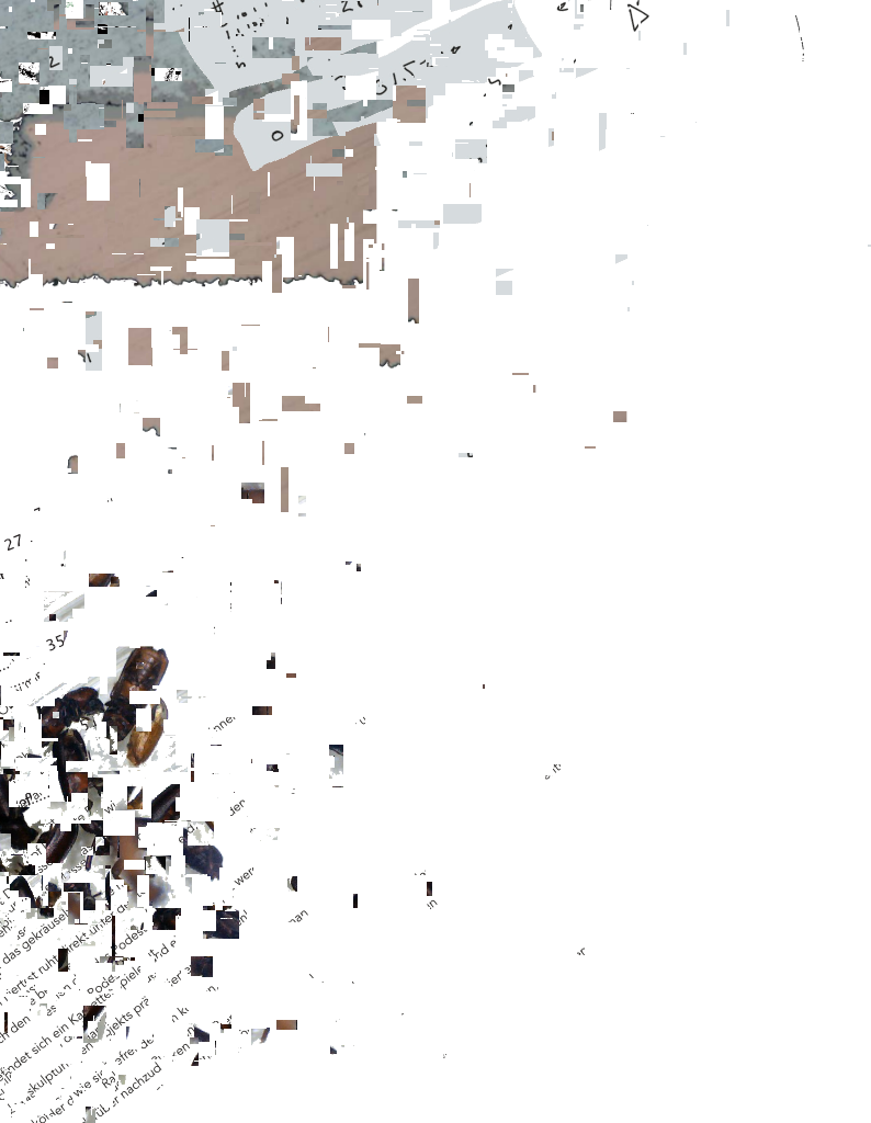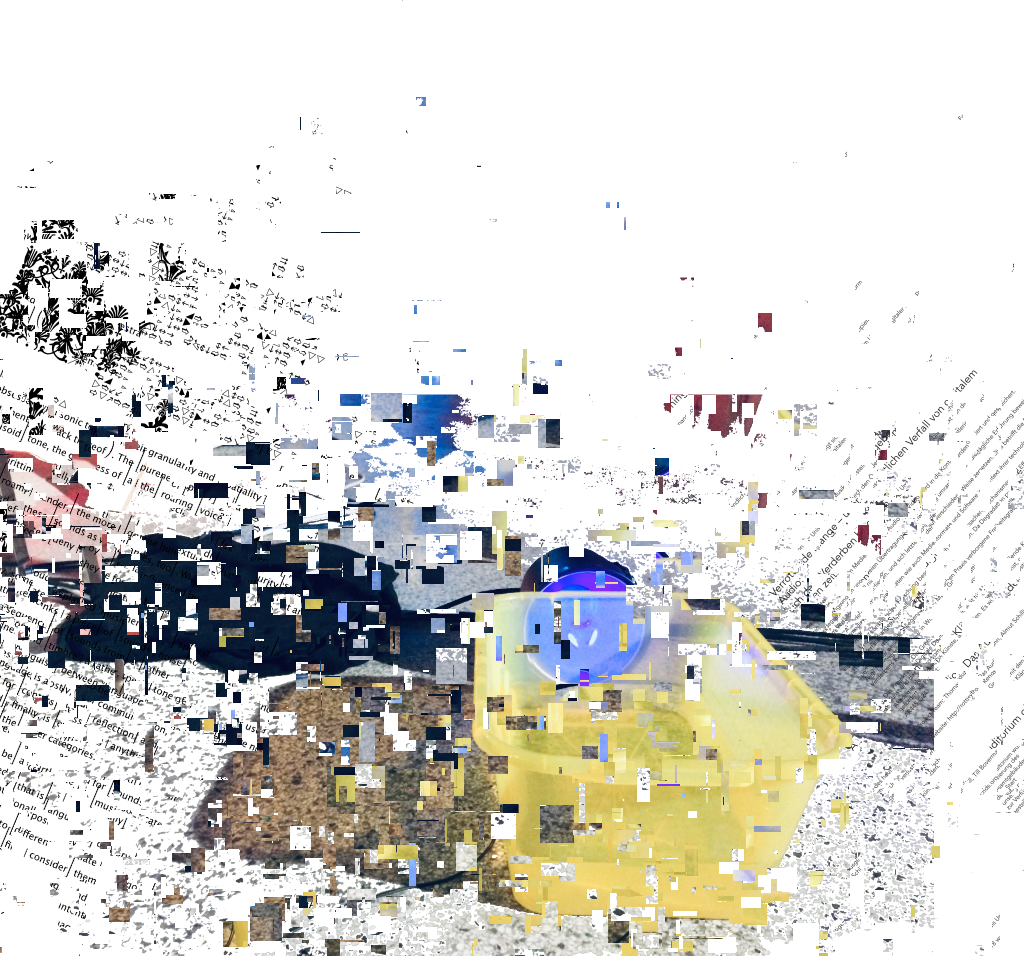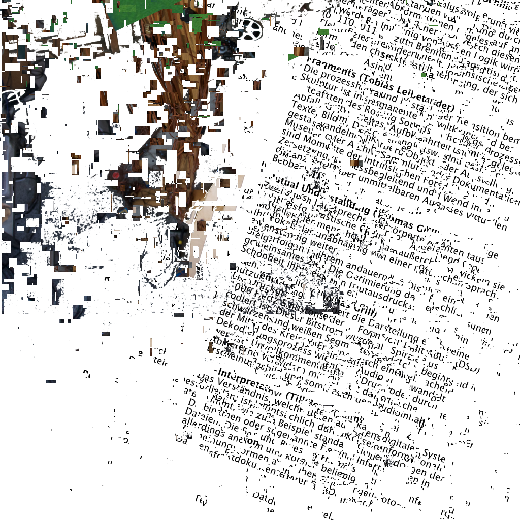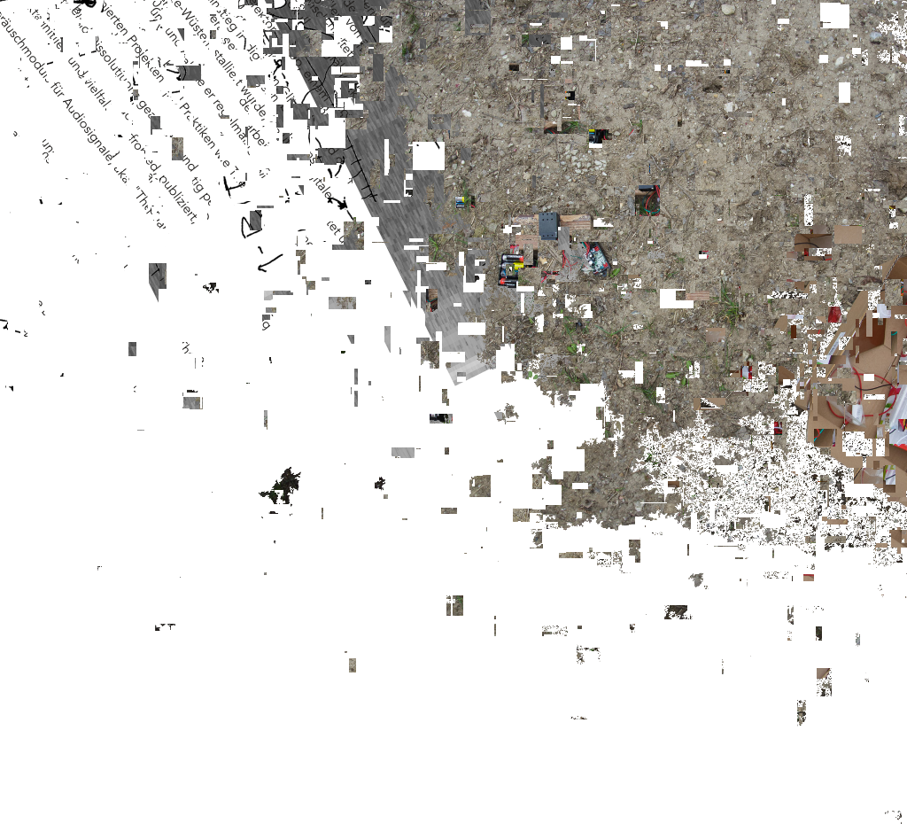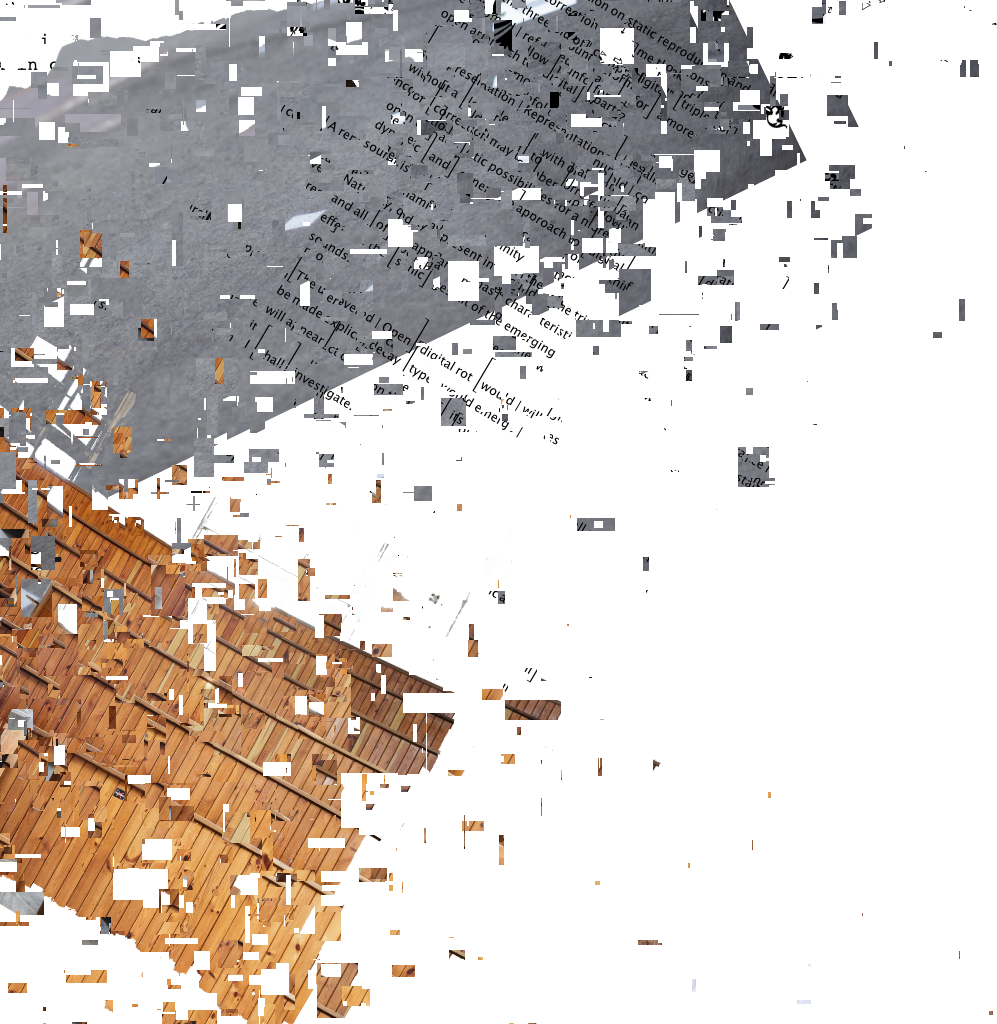 The processual sculpture "Fragments" is in permanent development and consists of artefacts of the "Rottings Sounds" project of artistic research*. Waste, things collected, things stored and things put aside, texts, pictures, data, sounds etc. are the basis of the shape-changing work. It is located at the Auditorium of Rotting Sounds. For this exposition, media representations of physical fragments have been arranged, then subjected to multiple stages of erosion processes specific to digital data. Object or exhibition, museum or archive, collection or documentation are moments of intrinsic research and decomposition, accompanying the process and resting in the distant but immediate eye of the virtual observer. *"Rotting Sounds – Embracing the temporal deterioration of digital audio" is a cooperation of the mdw – University of Music and Performing Arts Vienna, the University of Applied Arts Vienna and the Academy of Fine Arts Vienna. It is funded by the Austrian Science Fund (FWF) as project AR445-G24.