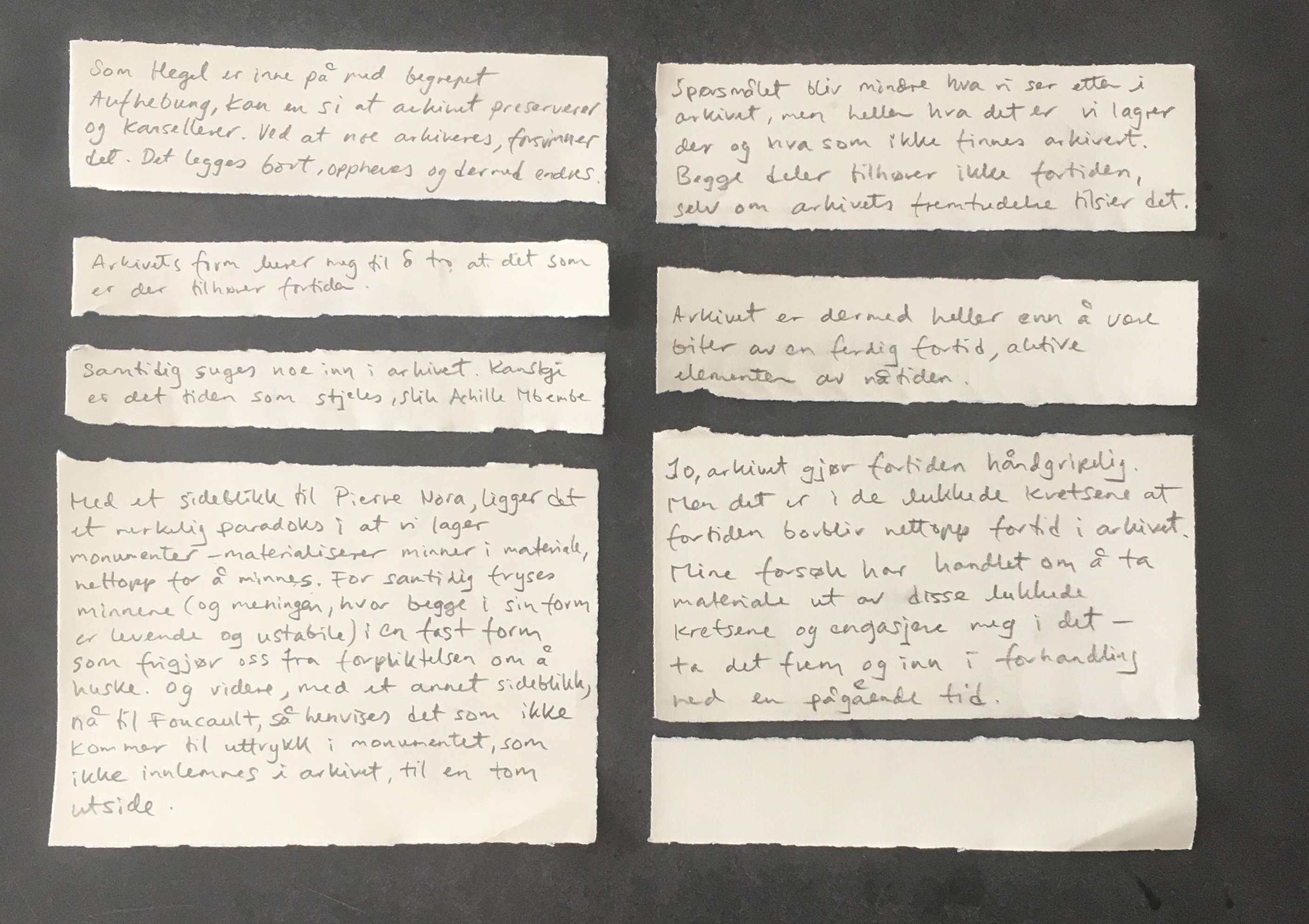 Dermed er arkivene mer enn noe annet ett avtrykk av de ulike epokenes historiske forutsetninger, slik Foucault påpeker, hvor språket, tidens forståelsesrammer, hegemoniske strukturer og teknologi fikserer et materiale – gjør det til «stillestående språk» [17:2]. Gjennom disse forutsetningene styrer og kontrollerer arkivene og måten vi operasjonaliserer det på, tilsynekomsten av minner og hukommelsens mulighetsrom. Her, og i oss selv, møter vi «reservoarer av fremmedhet»[17:3] som også hjemsøker oss.