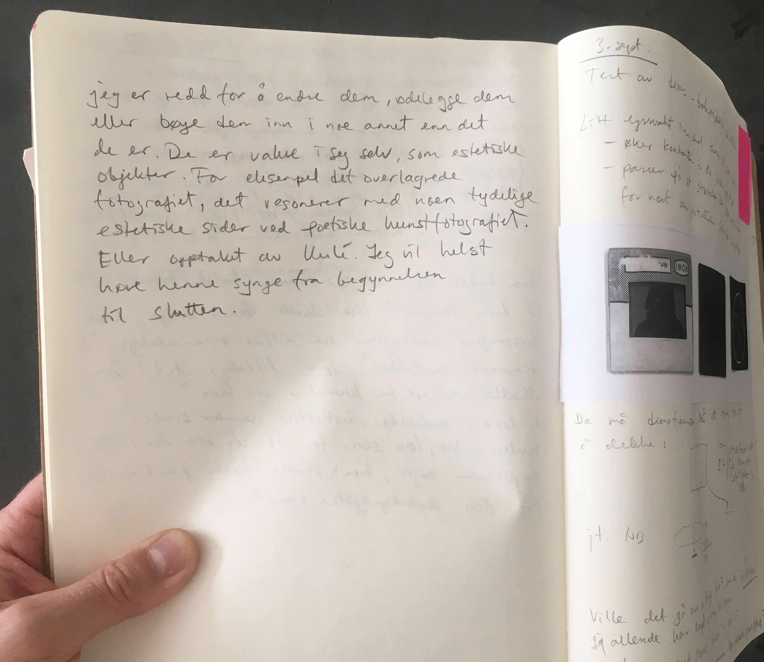 Som Ingfrid Breie Nyhus påpekte i en samtale vi hadde, så er det en vesentlig forskjell mellom et arkiv der de som har samlet det også har råderetten over det, og et arkiv der personene i arkivet og de som er i besittelse av det ikke er de samme. Denne distinksjonen løper som et viktig nivå gjennom alle prosjektene. Det er en faktor som skaper avstand eller nærhet, ulike grader av legitimitet for min tilstedeværelse, og ulike handlingsrom for både samarbeidene og mine egne kreative utforskninger.